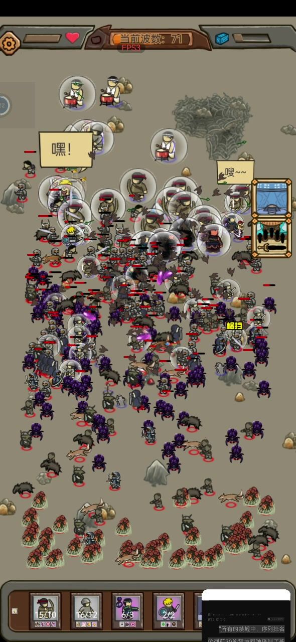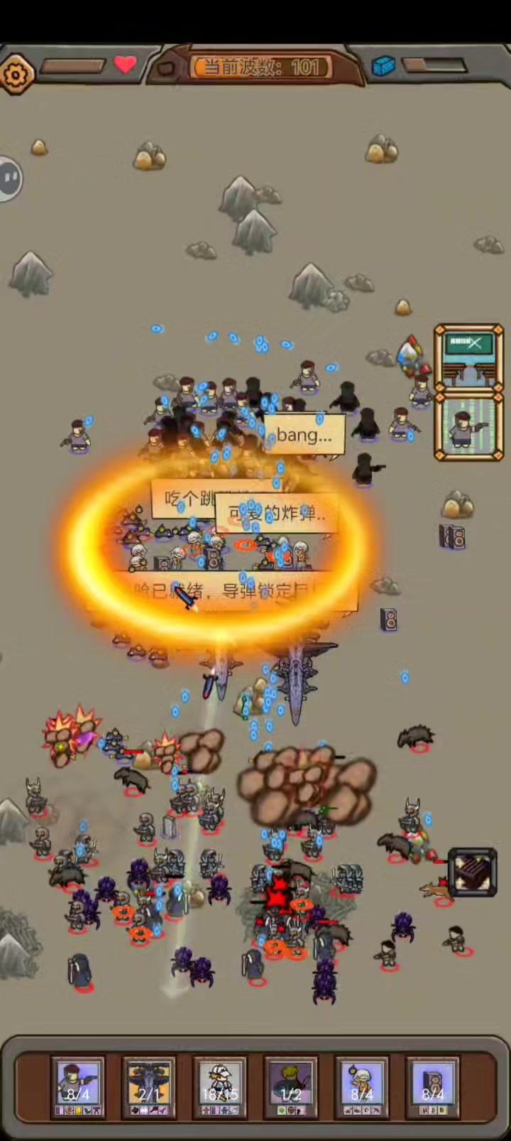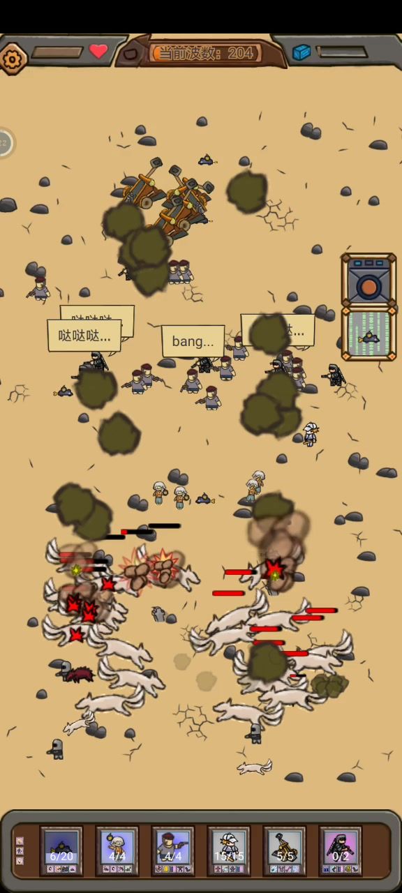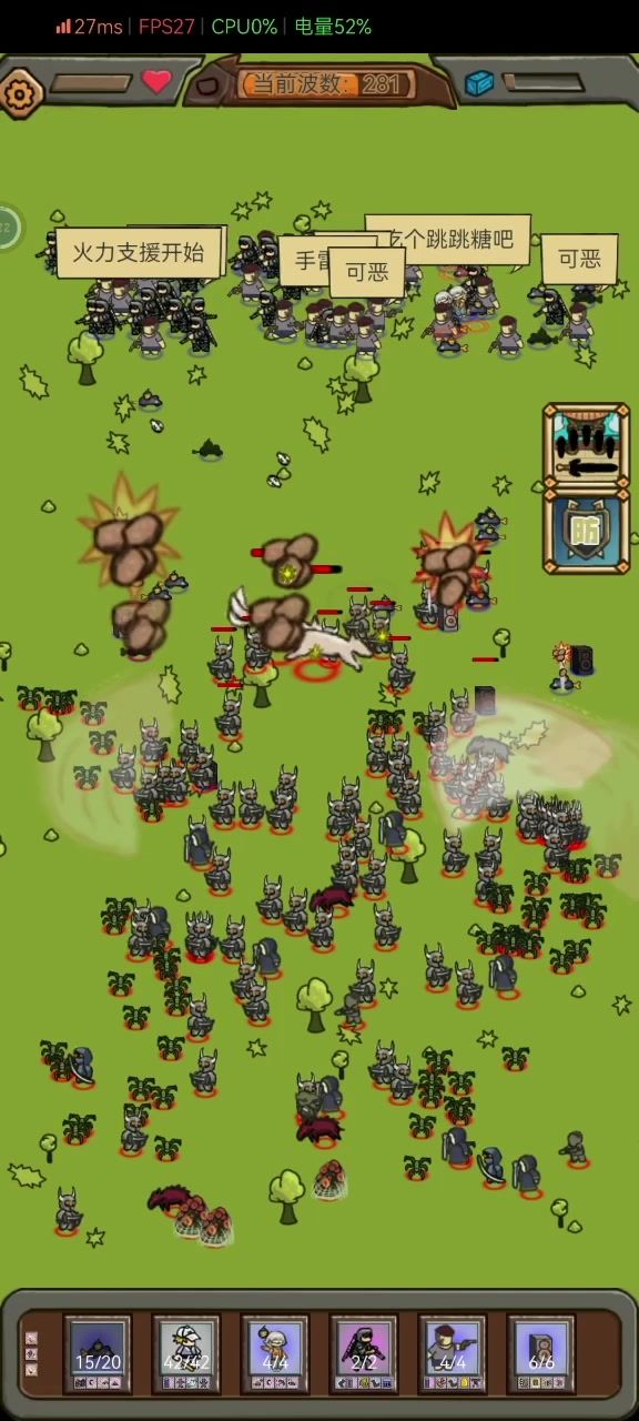枪手和士兵,性能优越,输出不俗,总人数最高48人,弹道速度极快,有aoe技能,会后撤步,炸弹哥还能给枪强化射速。棍哥,枪手和士兵,幸存者三件套绝对是无尽模式首选单位。 . 老鼠,拥有高达50%格挡,极短训练时间,行动速度极快,有aoe技能,炸弹哥配合音响还能屯老鼠,当之无愧的究极填线宝宝。 . 音响,2000血量,全图号角,仅仅四秒的训练时间,死了有高额自爆伤害,当之无愧的最强耗材。 . 阵容输出