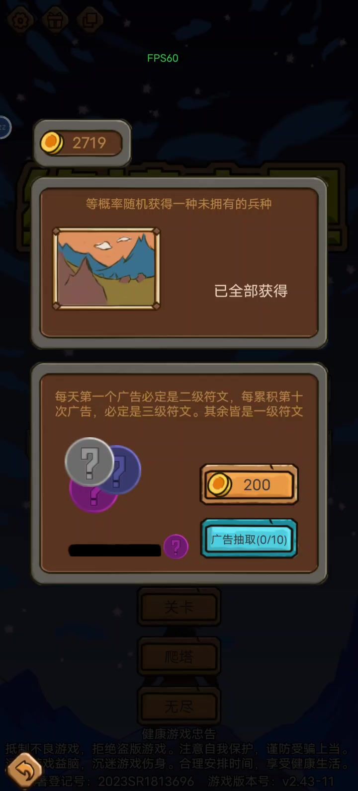 给大家发个攻略吧,希望对第一次玩的新人有用[表情_吃瓜] 我的现状:我也是新人,就玩了两天,没有佩戴任何符文,兵种也不全,关卡也没怎么打,文明也没有,时间几乎都花在无尽了,打到300多关,发现还没死,就懒得再打了。 我的理解:这游戏就是要把自己变得越来越强,和所有游戏一样,首先要解锁所有东西,然后再研究战术。 能解锁的有三个方面。1,兵种,看广告,打关卡,凑全兵种。2,符文,看广告,花金币买,给兵