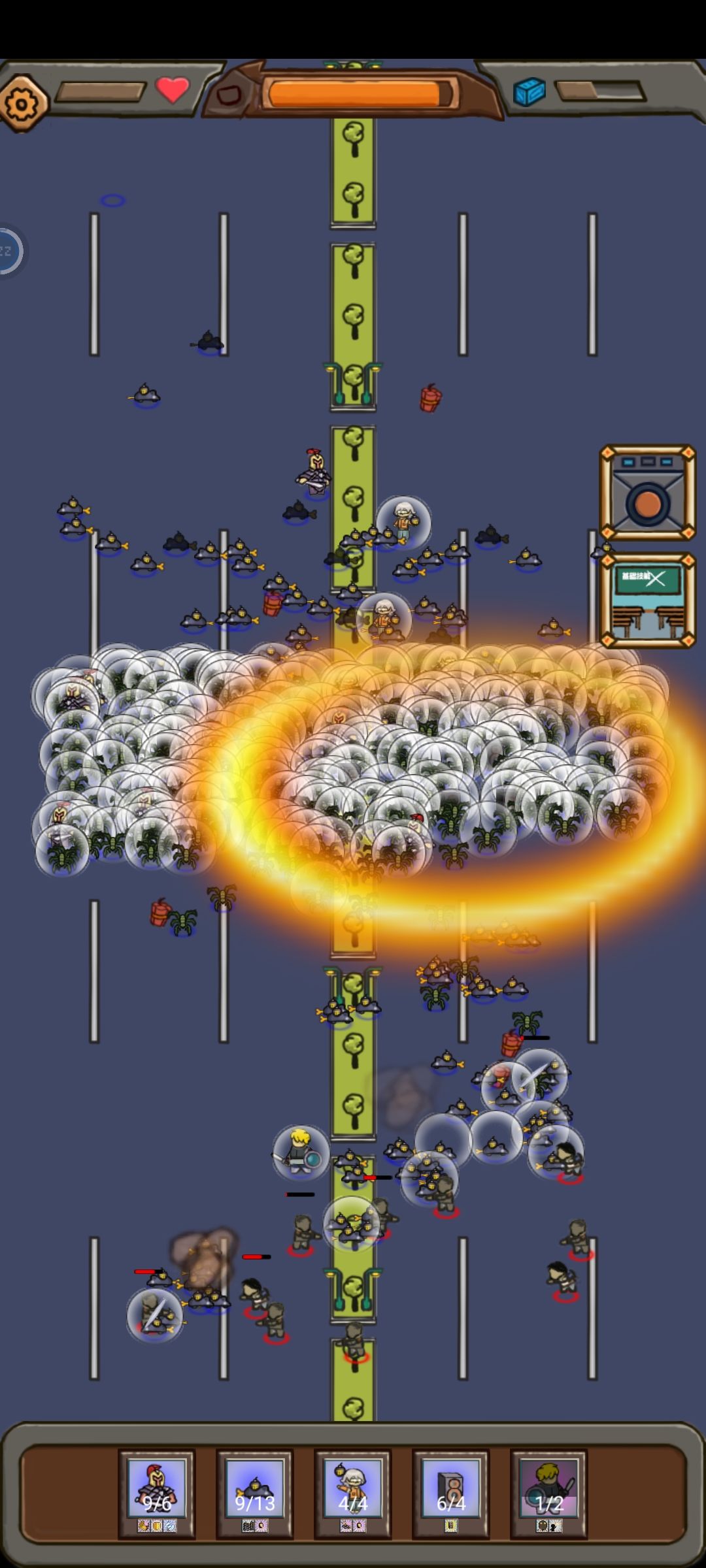 刚玩两天,发现就这个蜘蛛关是最难的,而且我符文也不全,好多都没3级,要打得过就得阵容硬,自己琢磨了一套:义军+国王兵+自爆老鼠+炸弹工程师+音响,起码打通地狱没问题。 文明:水枪(没法换),最后炸弹 1.这个阵容最重要的就是老鼠,符文我带的1,2级双生,极速,蜘蛛寄生,全靠老鼠自爆然后用蜘蛛吸引仇恨,所以必须老鼠开局,别的开局只能g。前期要点一级自爆伤害+20 2.然后音响是全兵种里属性最好的,就