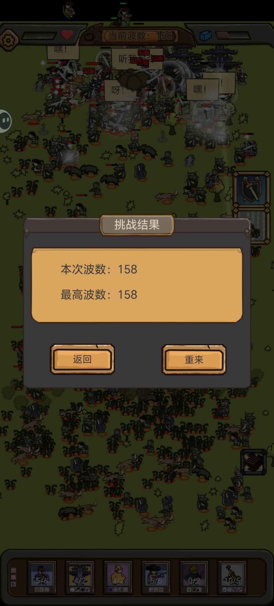 战舰3人数+攻速,投石车4强攻,勇者1视野1训练速度2双生,重甲兵1攻击距离1致盲2攻速,锯片硬汉3人数1双生,道士随便。 开局前压,投石车最后一个出然后文库锁定投石车,5人口以后取消前压开始让勇者送死,用勇者的限定技能刷出4战舰10投石车12锯片。大概80波之前都能搞定,然后继续前压一直到150+,压不住就回撤。(我开小差回撤晚了,死了很多锯片,不然大概能160+) 重甲兵的顺劈斩+致盲符文是