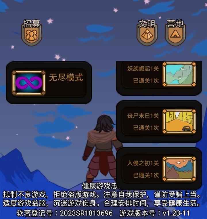 通关没啥好说的,广告能看的都看完,该解锁的地方都解锁了后也没广告看了,小品级游戏就这几个广告还是有必要支持下的。 剩下的就是卡关的话把每个主线对到四关以上,有了黑鸦➕持枪幸存者➕茅山后优先推妖族入侵,再解锁藏剑阁随便就能把主线推完了。 最后就是无尽,这个阵容挂到这,后期卡的一批,重启了下游戏没多久就挂了,不知道有没有更优的配置,不过无尽推再高也没奖励,懒得推了等更新了,主要就是前期堆输出技能,12