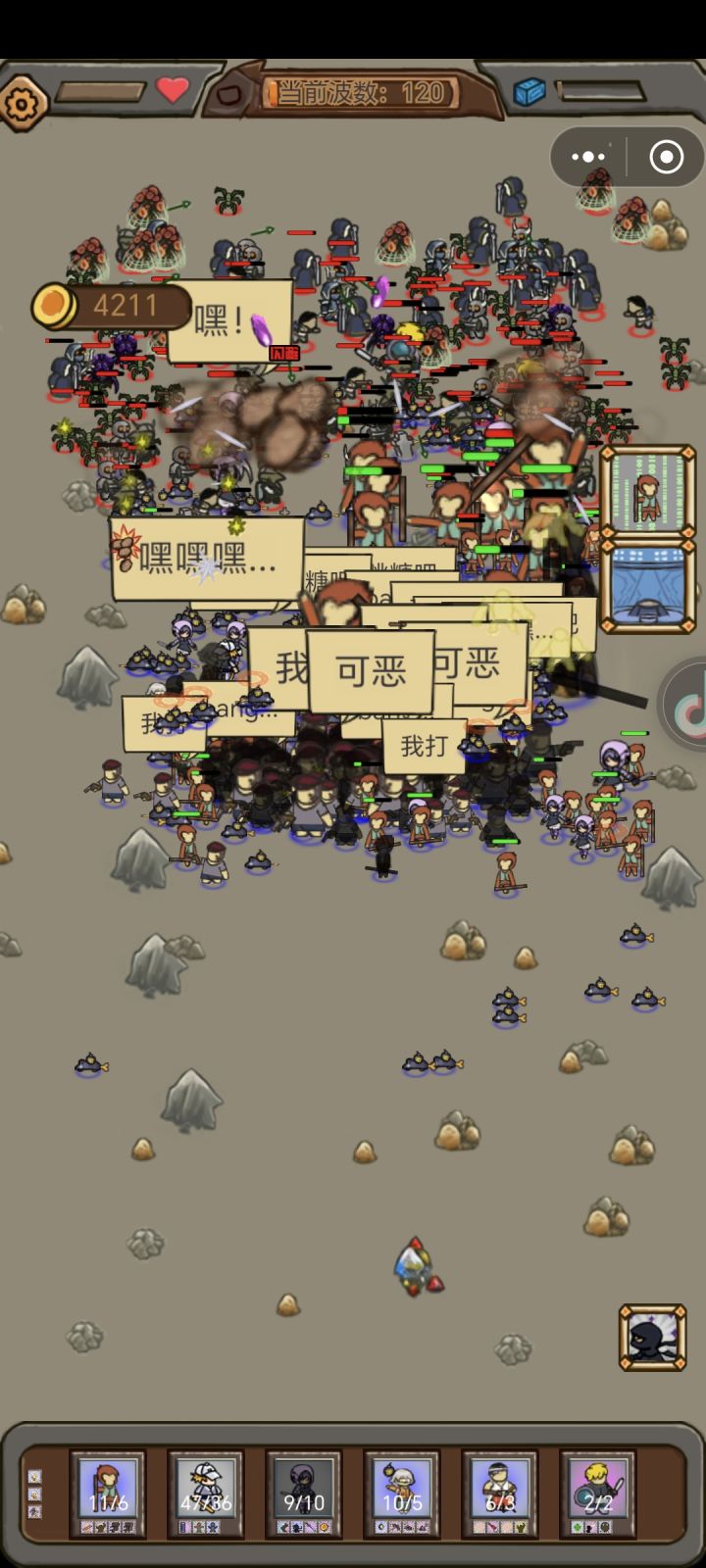 最能抗的兵种:猴子,基础步兵组合一:猴子+敲鼓兵(敲鼓男激活分身,无限分身,还能给加血上限)组合二:步兵+盾卫军(盾加盾,格挡,血上限,最多血的组合)发育最快成型最快的组合棒球男+手枪男(棒球男只学有几率召唤手枪男,手枪男学爆炸弹,这样就可以19个手枪男,缺点就是重启和被突破防线很容易就输了)最强的输出投石车没有之一负面bug兵种狙击手可以叠攻击上限,攻击加+1可以叠,升级2-3