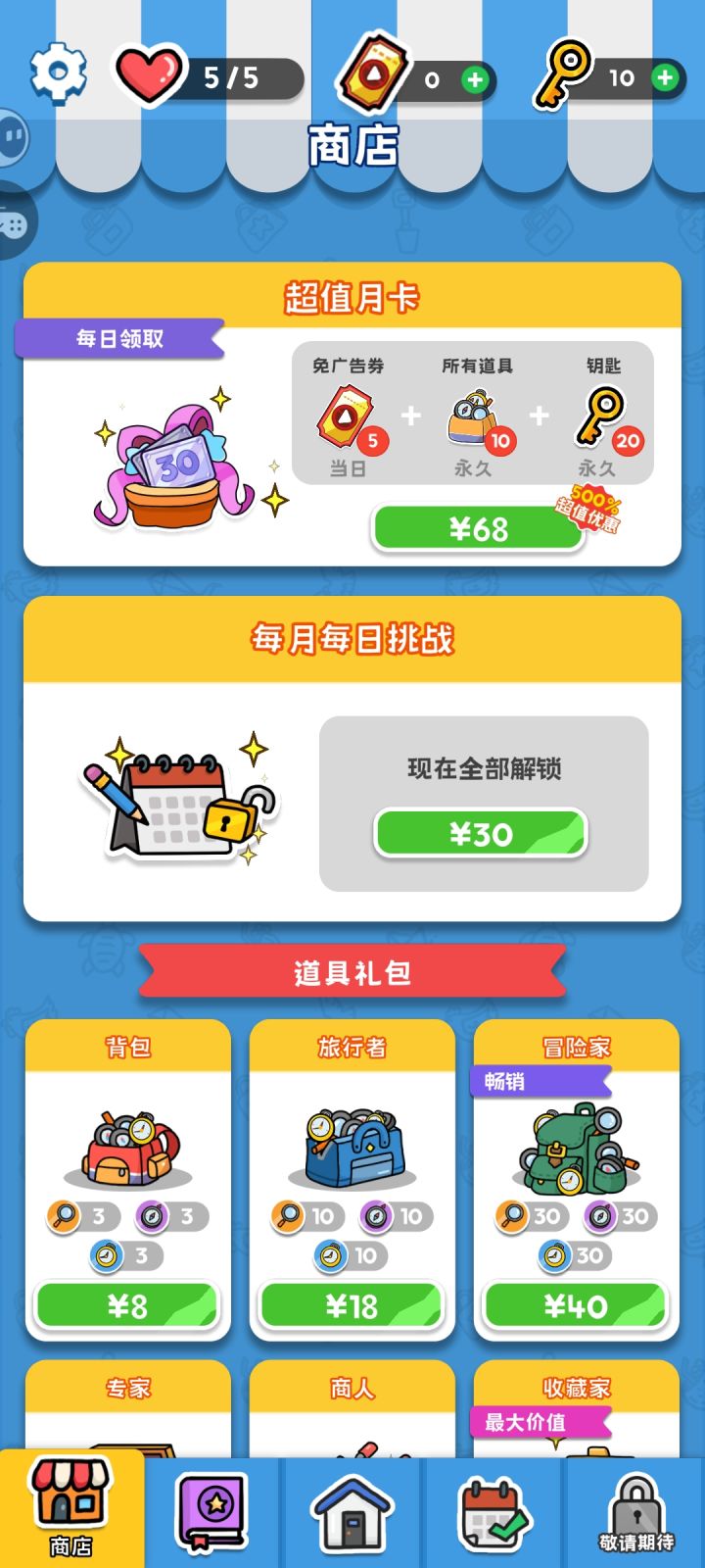混合变现,道具付费为主。包括免广告、各种道具礼包等,在轻度游戏基础上,付费已经蛮深了。广告点较多,大部分是功能类,如看广告解锁主题,每日挑战再来一局等,以激励视频为主,插屏在首次启动时有,游戏内似乎没有。