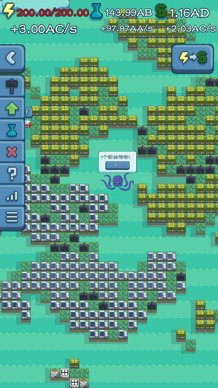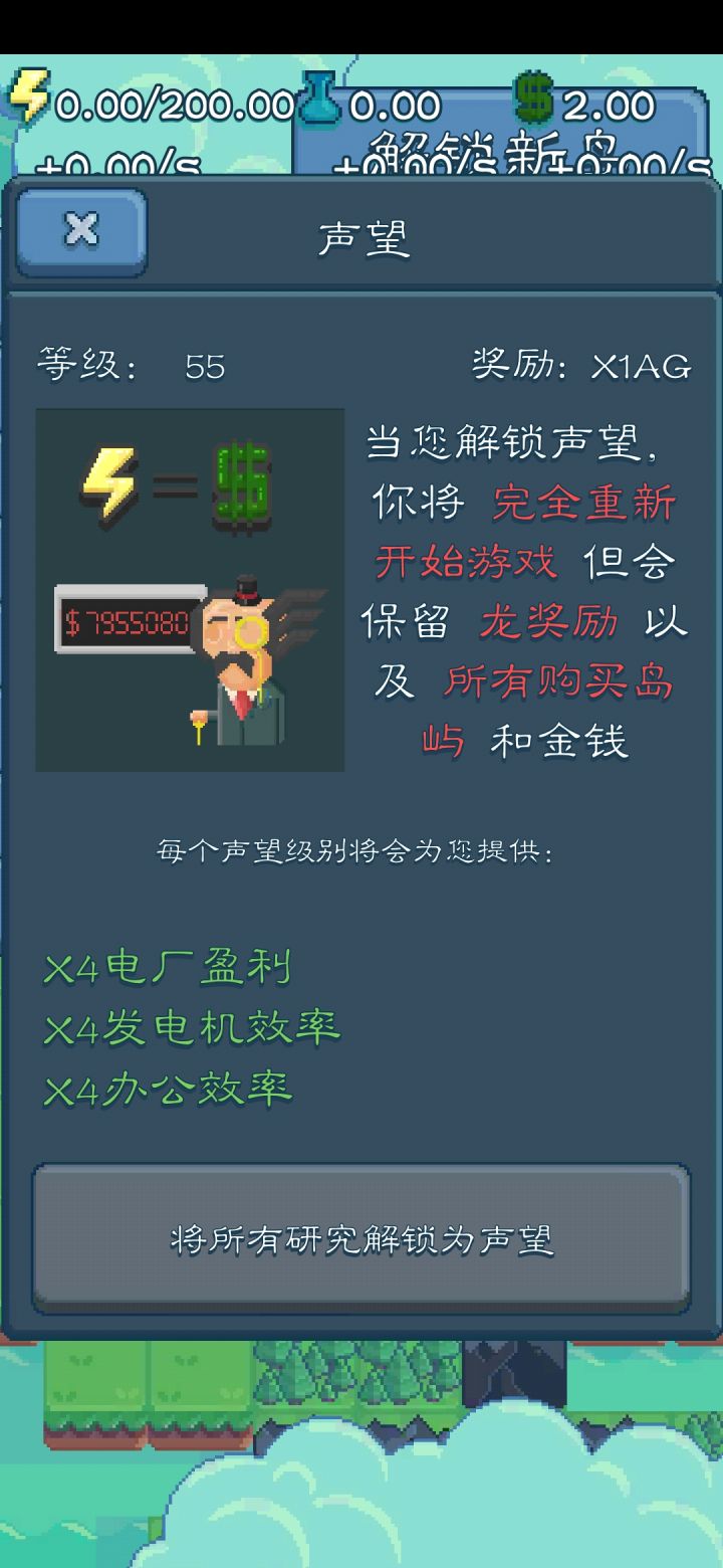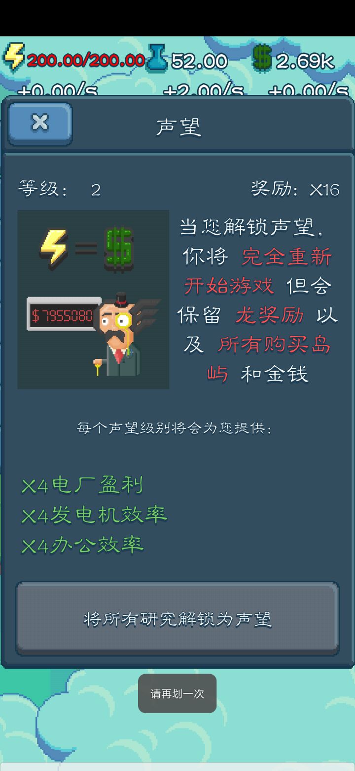 还有几十分钟就可以完成所有研究,我一共就玩了两天。那么我该不该解锁声望呢?显示说“完全重新开始游戏” “保留龙奖励和所有岛屿金钱” 然后是四倍办公,发电厂,电厂效率。那我是先赚足足够的钱再解锁,然后解锁之后就能更快的赚钱,还是马上解锁再赚钱。怎样做利益最大化呢?真有点糊涂。还有章鱼会保留吗?我已经到了210%然后和大家分享一下我自己的一个小绝招吧。快速赚钱。我安排好整个地图,一个发电机配四个