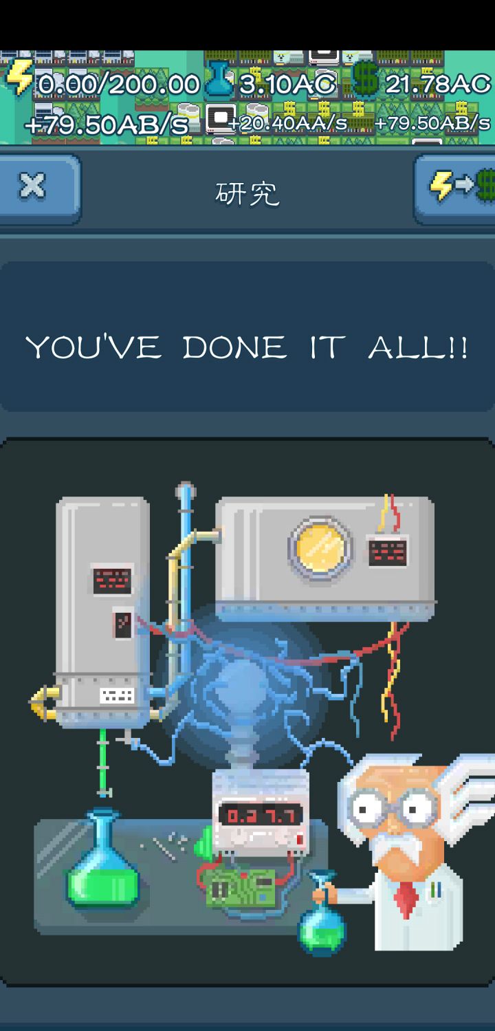 2天成绩,看图说话,无修改!全靠ad发家!1,有条件的,多看ad,发家全靠ad,你赚点乐子,作者赚点烟钱!一个ad顶过你放半小时!2,迅速升级你的发电机转换效率,产量上去了,才能赚更多钱!太阳能板是个坎,多少得升级产能点数,换燃煤后就迅速发家了。3,不要吝啬舍不得换新设备,那是有10~100倍的差距!4,研究产量和金钱产量,如同鱼与熊掌,不可兼得!没必要平衡,等金钱产量上去了,就使劲砸