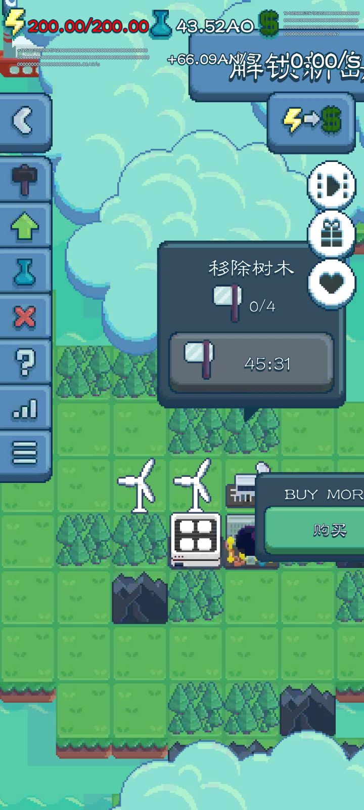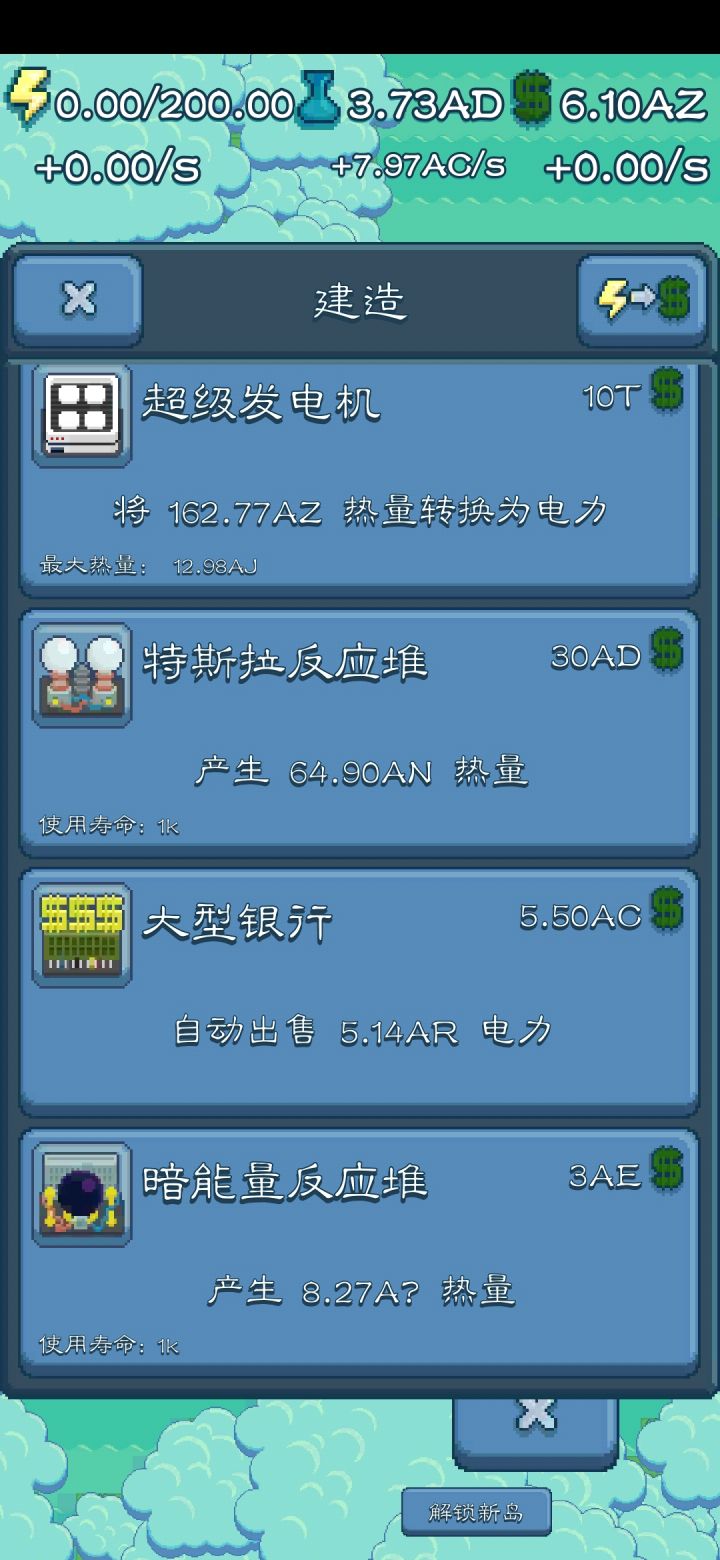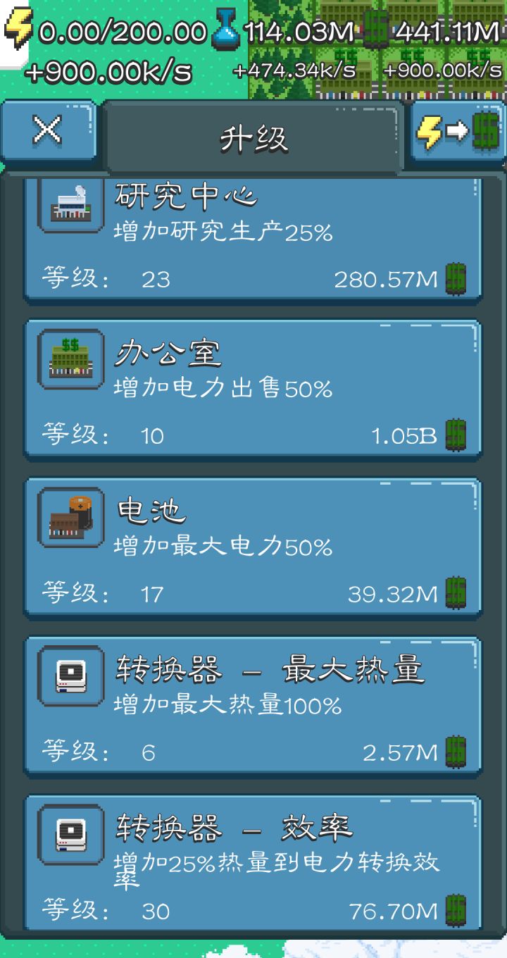 玩了一段时间了,除了第一周目比较漫长之外,后面的周目越来越轻松,变成了机械操作,是时候关掉游戏分享些心得了。本游戏的建筑有5类:热源(太阳能板、聚变反应堆等等,不含风力发电机)、发电机(将热量转化为电力,风力发电机也可以视为特殊的发电机)、电池、办公室、研究中心。其中研究中心很好理解,只有3级,更新很慢,通常会占据最多的地皮,升级是共用的,尽量堆高等级。电池仅在第一周目用过极少的几次,二周目