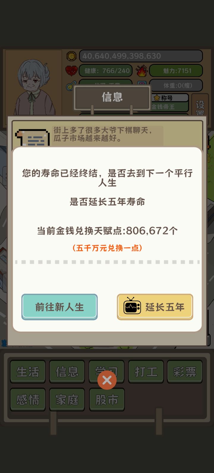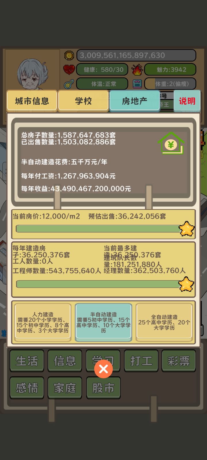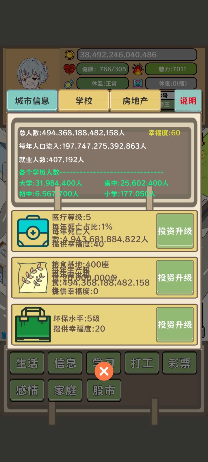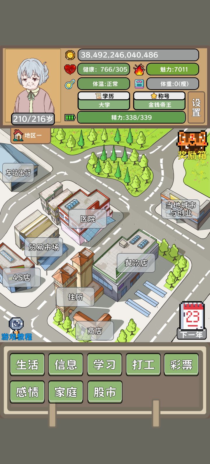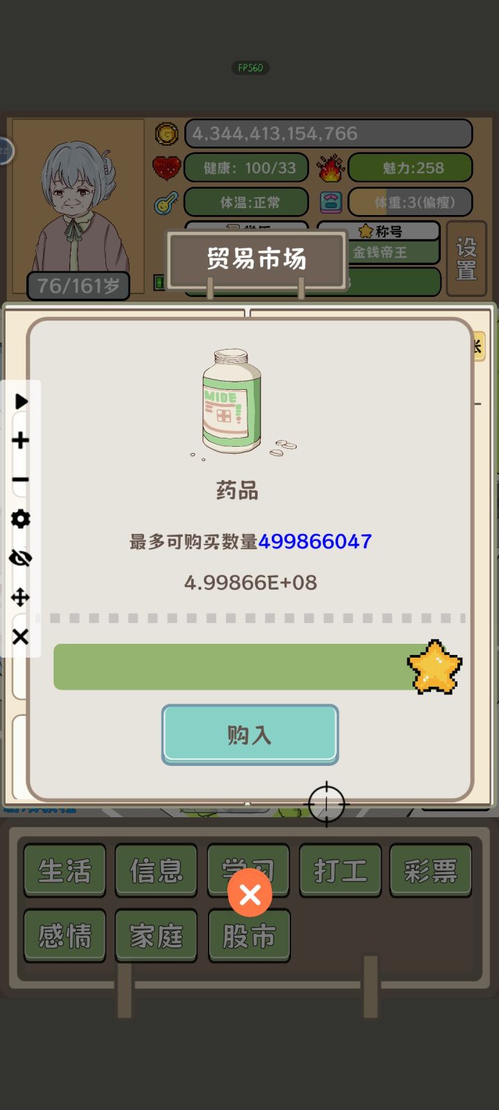 玩呢那有玩了能有一个半点啊,实在是受不了了,后边太折磨了,根本没办法一直刷钱,到后边买的货物会越来越多,但是一旦买的多了,它就会出现特殊符号,比如说1E,这种字样也也就买不了了,你就得把它往前边推,推到全数字的时候才能买,导致后期的时候买一次东西就得分好几波。这游戏完全就是一个半成品,没啥可玩的,尤其是等到后边买东西费事之后,你会发现建学校才是大道,这里边可以无限建,再加上可以无限买药,每过1年都