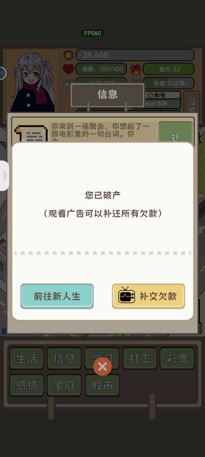 开局看7个广告,拿到每年加健康的buff不用穿衣服,吃东西,健康不够去医院就行,前期一直低买高卖,不买任何东西,不消费就不会破产,有钱了就可以一个能力范围内最贵的房子,装备后直接原价卖了,加成还在,而且没消耗车子卖会折价,但是比养车划算,买个0消耗的车到处逛还是很香的后期需要精力升学校的时候再吃东西前期无聊可以去餐厅搞个店长当当,升满一年赚个140w左右,前期还可以建学校等靠