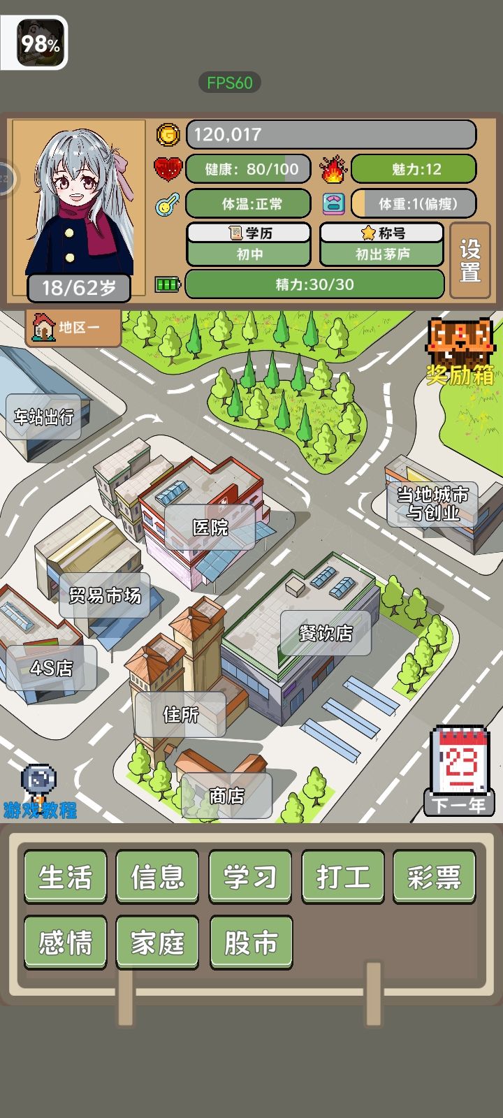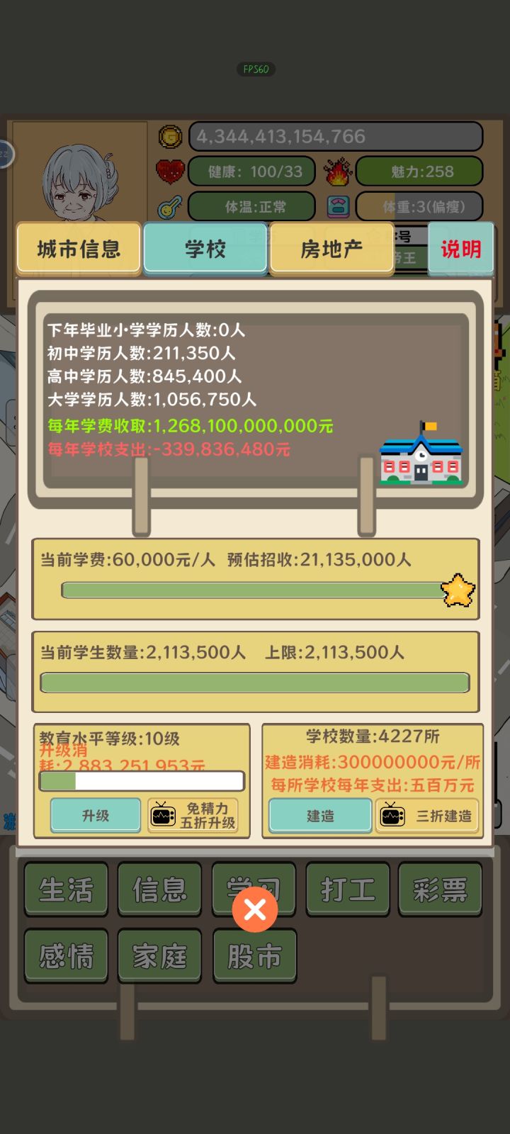 无脑买卖就行,前期看完广告,不吃不穿,低买高买,后面存够一千万取个每年送五百万的老婆,继续买卖,学校建不建无所谓,后期一次买卖几十万亿上百万亿,有钱了记得把吃穿用度弄好,商店药水每年要买满