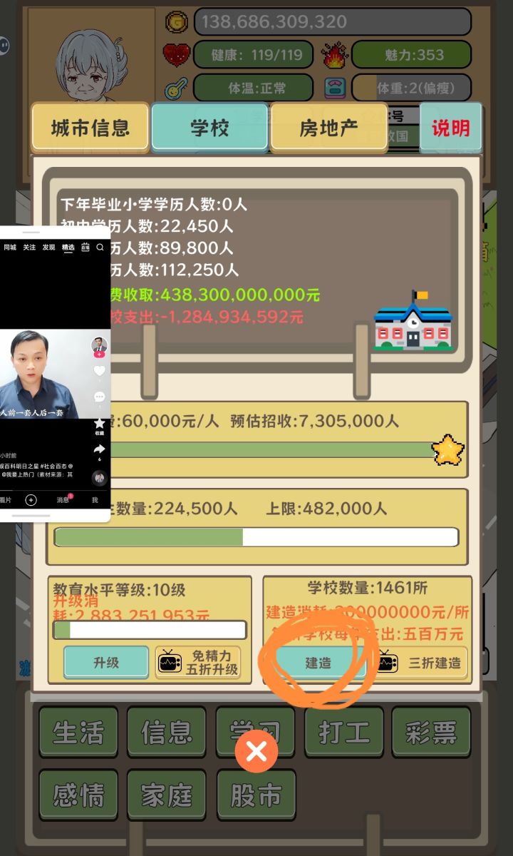 开局…………打开游戏先不要开局,先去把天赋富家子弟弄到1级(看俩广告+20技能点去升级一次富家子弟),然后开局,看七次奖励箱的广告,弄好生活页面后,然后去4S店买最便宜的车跑滴滴攒钱,攒到自己认为合适的数(最好一百万以上)就去无脑买卖,一直无脑买卖至几千亿的时候(记得顺便多买寿命药),再去学习页面把学历弄到大学,把教育和建筑学分弄到三百后,就可以去建设学校了,然后建设五百所学校,教育水平拉满(十级