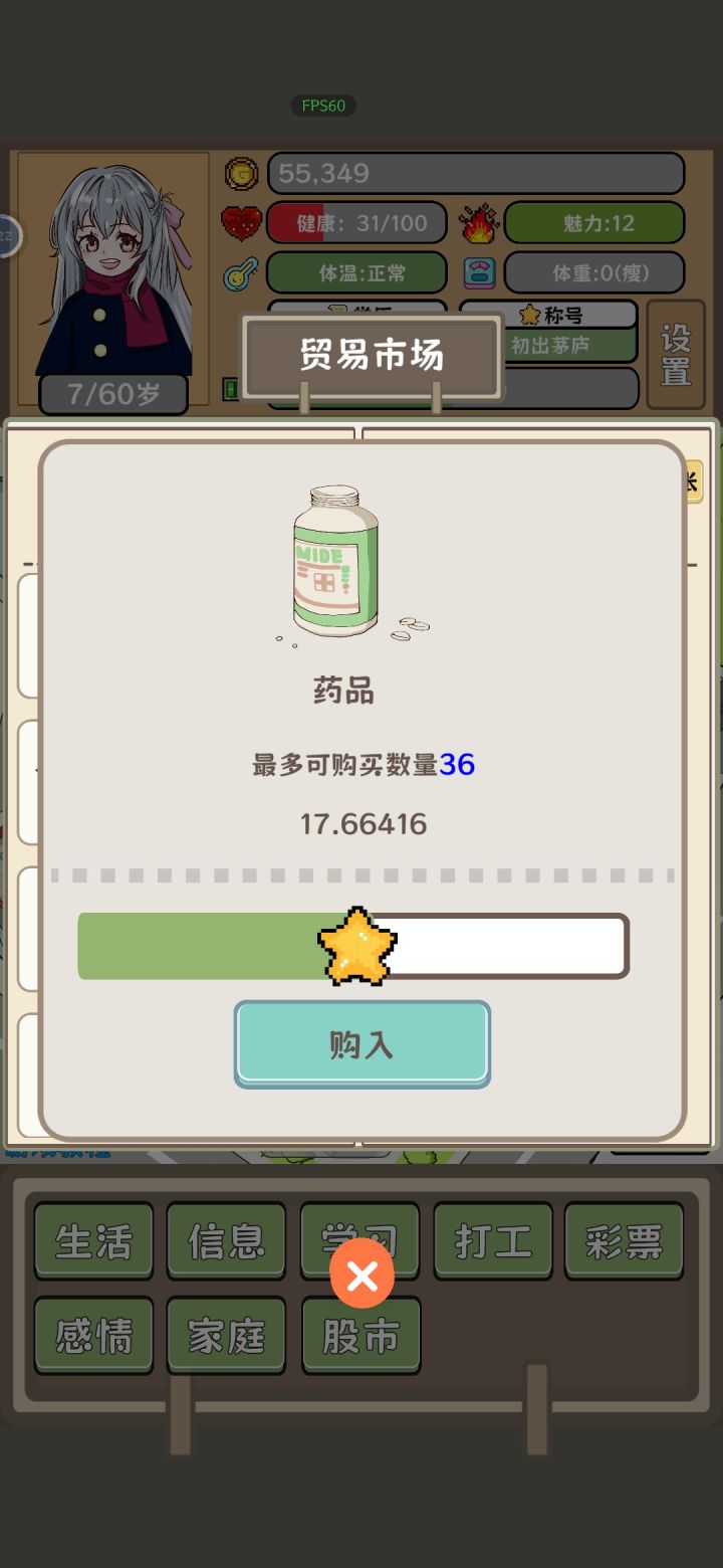 初始市场价格截图,然后低买高卖,信息不一定准,有时候没信息买卖也能赚钱,快速买车跑滴滴,不过跑滴也就前几年跑跑,有一定钱后商店精力全买,然后全精力读书,大型之后结婚,结婚每天150精力,有个几十亿之后可以搞学校,后期学校是最赚钱的,买卖已经bug了金额太大买不了,调小金额又浪费时间,全力搞教育就好了