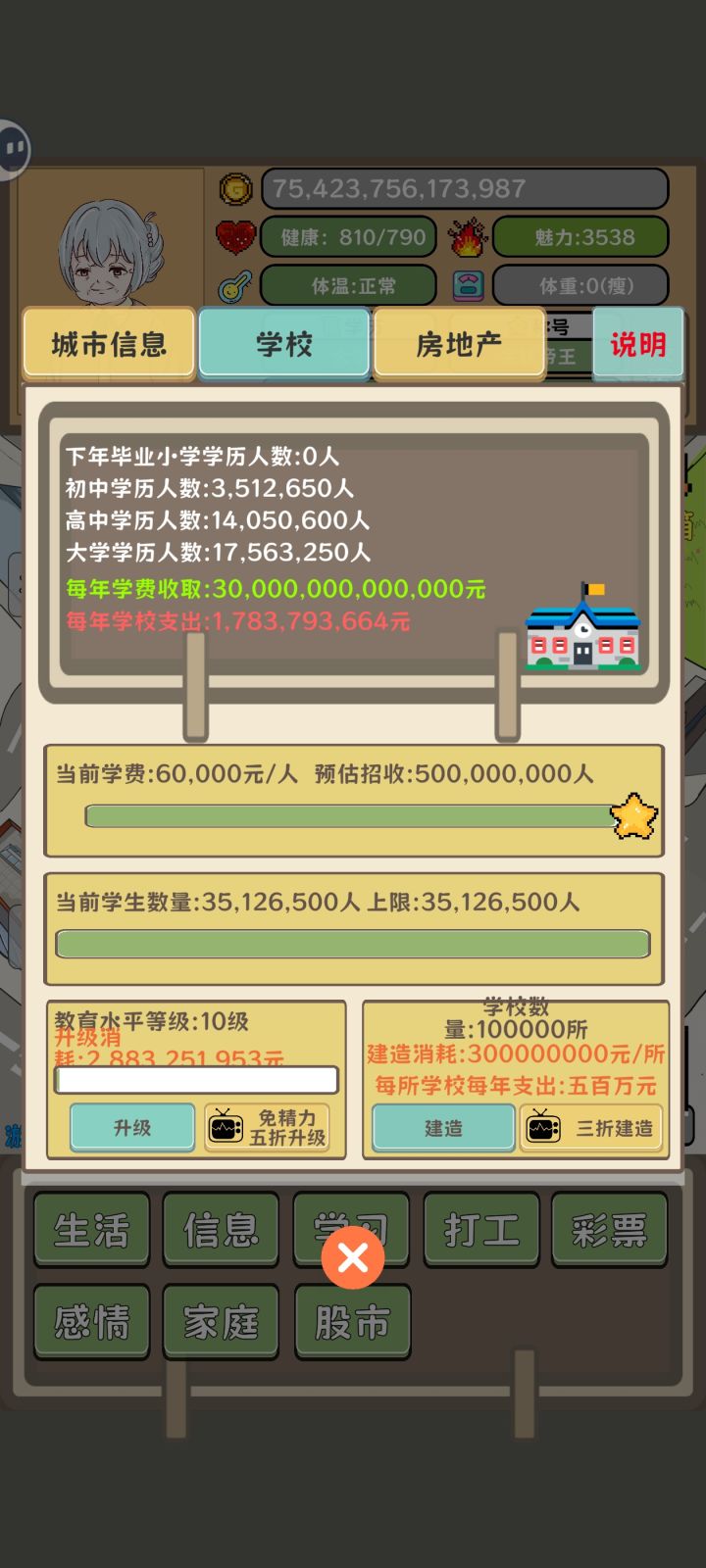 无脑买卖就行,前期看完广告,不吃不穿,低买高买,后面存够一千万取个每年送五百万的老婆,继续买卖,学校建不建无所谓,后期一次买卖几十万亿上百万亿,有钱了记得把吃穿用度弄好,商店药水每年要买满