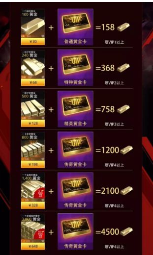 据说黄金卡是一种特殊的黄金优惠福利,目前可以在游戏内的VIP商店获得。黄金卡作为一种时限性道具目前有4种额度。在购买黄金礼包的时候,使用黄金卡将产生意想不到的优惠福利,二蛋看后感觉真是太超值了,各位狙友们你觉得呢~