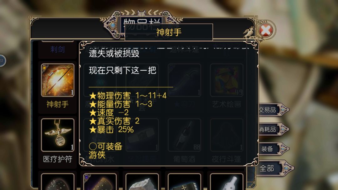 吸血鬼克星:物理/能量/灵魂防御+3,附带被动技能生命活力(效果不明),全职业通用。 毒镖袋:毒镖2,技能效果:射出毒镖,可能使目标中毒(强壮判定),物理伤害,魔法消耗2星,体力消耗100%,冷却时间10秒。全职业通用。 刺客的素养:夹击2,效果:邻近队友近战攻击时,消耗20%行动力对目标追击一次近战攻击。体力消耗20%,cd1秒。全职业通用。 光明之心:全职业通用,物理/能量/灵魂防御+3,盲战