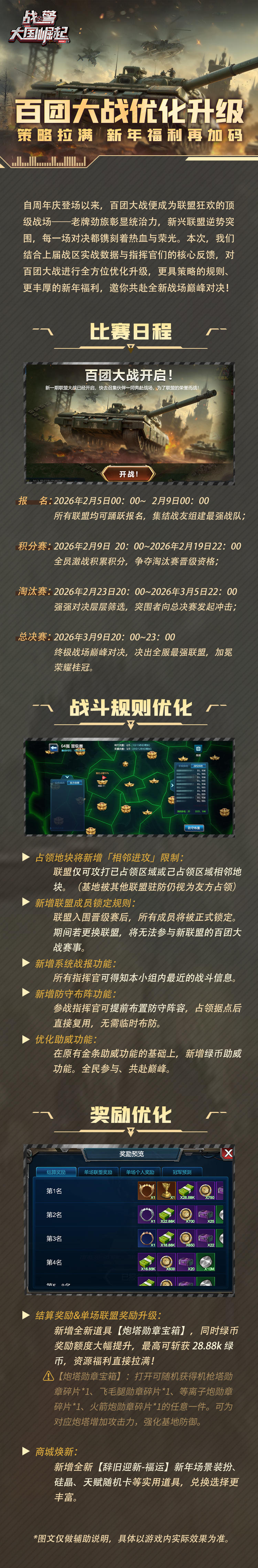 自周年庆登场以来,百团大战便成为联盟狂欢的顶级战场——老牌劲旅彰显统治力,新兴联盟逆势突围,每一场对决都镌刻着热血与荣光。本次,我们结合上届战区实战数据与指挥官们的核心反馈,对百团大战进行全方位优化升级,更具策略的规则、更丰厚的新年福利,邀你共赴全新战场巅峰对决!本次百团大战将在春节期间开启,一起来看看都有哪些变化吧!
