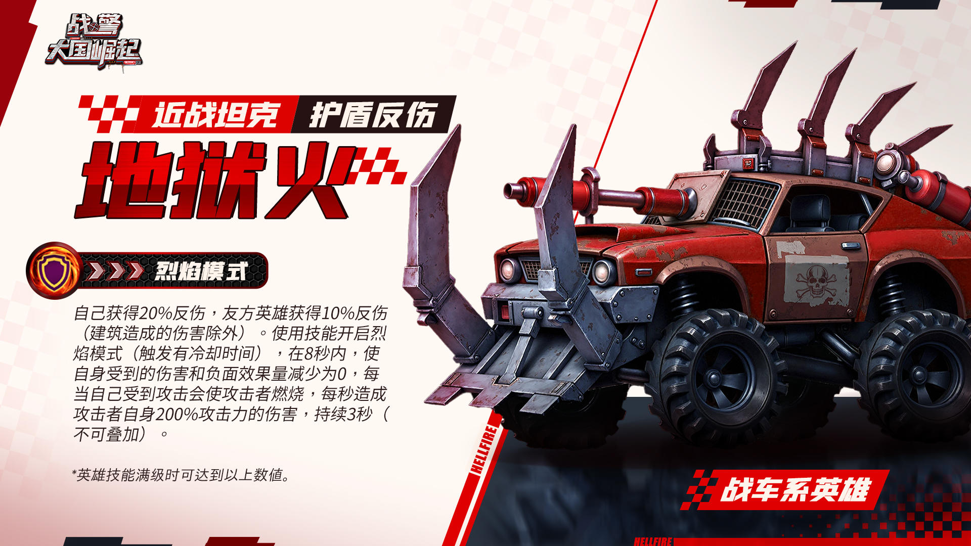 战场深处焦土翻涌,灼热风浪裹着重型引擎的咆哮碾过废墟 ——「掠食者」在锈红硝烟中猛冲而至!车头巨铲撞碎掩体的钝响压过枪炮轰鸣,车身骷髅徽记刚显冷光,便已让敌方阵线浸满战栗。在弹火交织的混战里,这辆狂野战车,正以钢铁利齿撕开敌阵,为指挥官辟出一条烧向胜利的血路。定位:近战坦克 护盾反伤活动时间:1月1日00:00~1月10日23:59获取方式:地狱火之魂可在主界面右侧限时英雄入口抽取,累积10