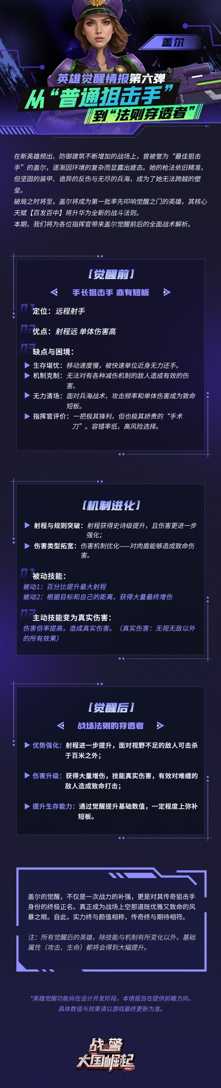 在新英雄频出、防御建筑不断增加的战场上,曾被誉为“最佳狙击手”的盖尔,逐渐因环境的复杂而显露出疲态。她的枪法依旧精准,但坚固的装甲、诡异的反伤与无尽的兵海,成为了她无法跨越的壁垒。破局之时将至,盖尔将成为第一批率先叩响觉醒之门的英雄,其核心天赋【百发百中】将升华为全新的战斗法则。本期,我们将为各位指挥官带来盖尔觉醒前后的全面战术解析。