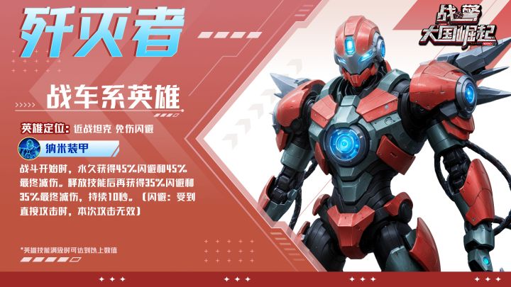当机械轰鸣碾碎战场宁静,血刃机甲携金属风暴降临!以机甲为胄,双臂搭载的 “裂空弯刀” 是收割生命的死神之镰。在废墟与硝烟中,用钢铁之躯碾压敌手,以机械利爪撕碎威胁。这台尖端机甲,只为碾碎一切抵抗而生!定位:近战坦克 免伤闪避活动时间:3月25日00:00~3月31日23:59获取方式:歼灭者之魂可在主界面右侧限时英雄处抽取,累积100个歼灭者之魂即可合成该英雄。#战警大国崛起