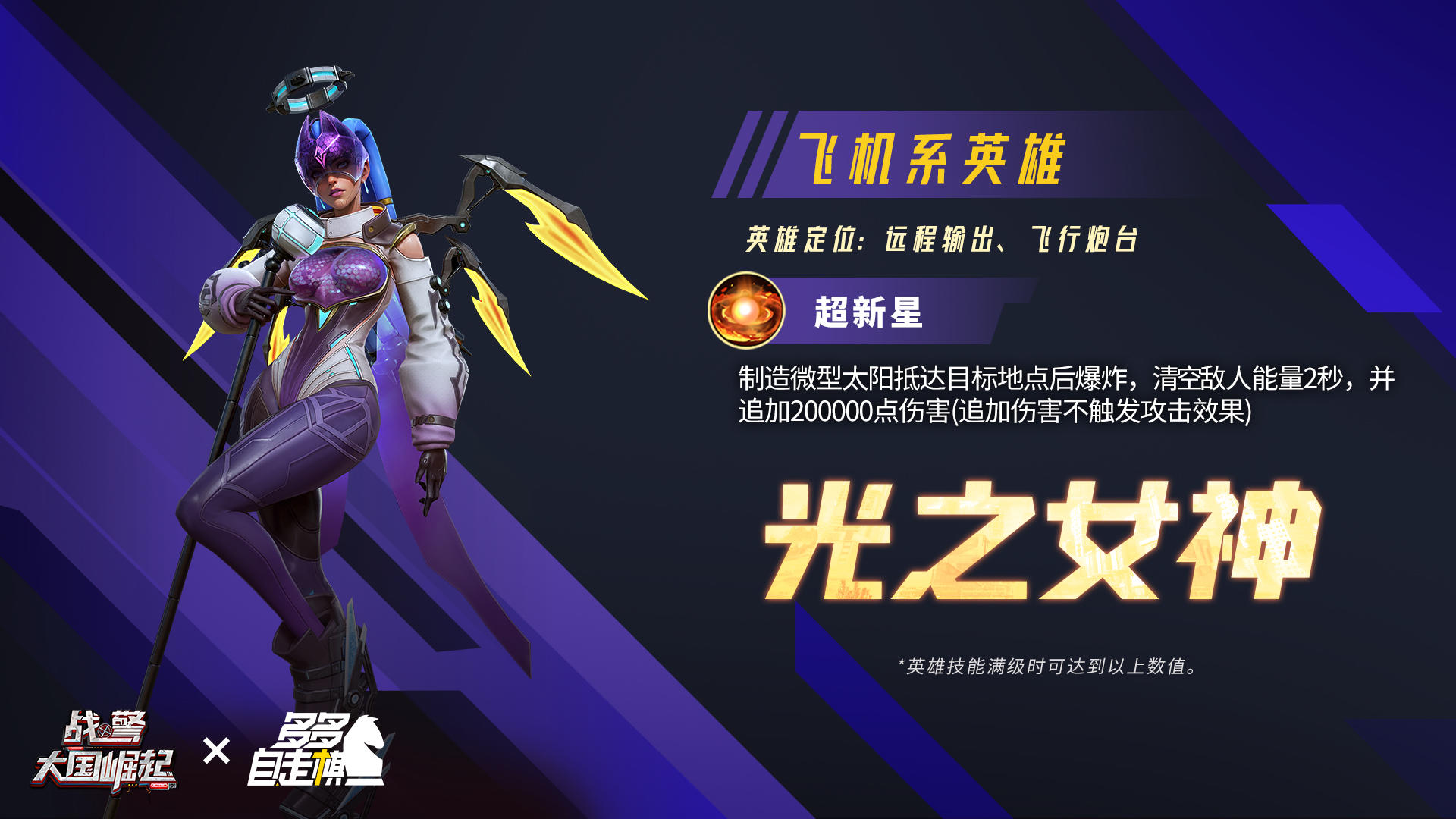 曾经的她不过是音乐森林中的一只娇弱精灵。黑暗魔法骤然降临,为守护家园,她毅然吸纳蕴含强大力量的紫色宝石。自此身躯蜕变,紫色金属战衣加身,刀锋翅膀破背而出,神圣光环闪耀头顶,金属麦克风成为武器。定位:远程输出 飞行炮台返场时间:1月11日00:00~1月17日23:59 获取方式:光之女神之魂可在主界面右侧限时英雄入口抽取,累积100个光之女神之魂即可合成该英雄。 官方优惠充值上线!最高10