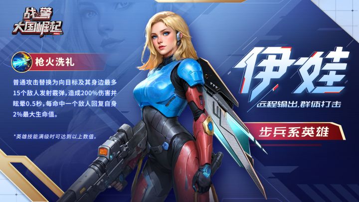 耀眼金发如破晓之光,幽蓝眼眸似深渊洞察一切,神秘蓝甲铭刻着古老传说,钢铁之翼如刀锋般划破黑暗的璀璨金光破空而来!这位兼具绝美外形与超强实力的传奇战姬,已踏上《战警:大国崛起》的战场! 定位:远程输出,群体打击活动时间:1月18日00:00~1月24日23:59获取方式:伊娃之魂可在主界面右侧限时英雄入口抽取,累积100个伊娃之魂即可合成该英雄。