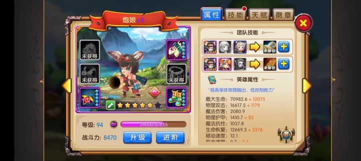 物理英雄一一炮娘(库琦)一一极高单体物理输出,低控制能力技能介绍:一一浮空弹[伤害]炮娘发射出一颗巨大炮弹炮弹接触敌人后爆炸,对一名敌人造成6995(+215%物攻收益)点物理伤害。一一红莲射击[伤害][控制]炮娘原地旋转,射出无数炮弹,对敌人造成5229.07(+150%物攻收益)点物理伤害并击退。对90级以下的敌人必中。一一狂暴射击[伤害] [控制]炮娘摆好射击姿态向前方距离射