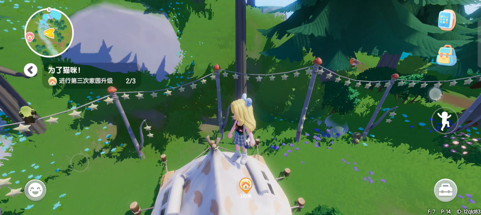这个黄色大伞上面的泡泡,里面是一条百褶裙,先从旁边的石头一层层跳上去,然后瞄准泡泡在的位置,冲刺跑+跳跃,就能跳到伞上了,要注意的是方向一定要准确,因为这个泡泡位置很高,只有在跳过去下落的时候才能拿到,如果跳歪了下落的时候是拿不到的,跳到伞上也是碰不到的