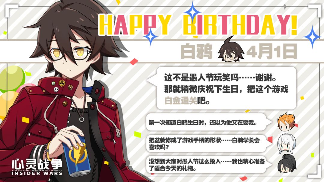 4月1日,是我校白鸦同学生日。首先,本人代表新闻社祝福了他生日快乐。 因为是愚人节,险些被他认为是新闻社的整蛊计划,实在是有些伤感,于是本人决定对他进行侧面调查。 本人在外出搜集相关资料之时,发现学校公告栏有几位同学正在围着一张海报讨论,本人利用记者的直觉,捕捉到了关键信息——白鸦同学似乎很经常去漫展试玩游戏! 经历种种交易后,本人也获得了一张萤火虫漫展《心灵战争》志愿者的招募海报。 这是一条非常