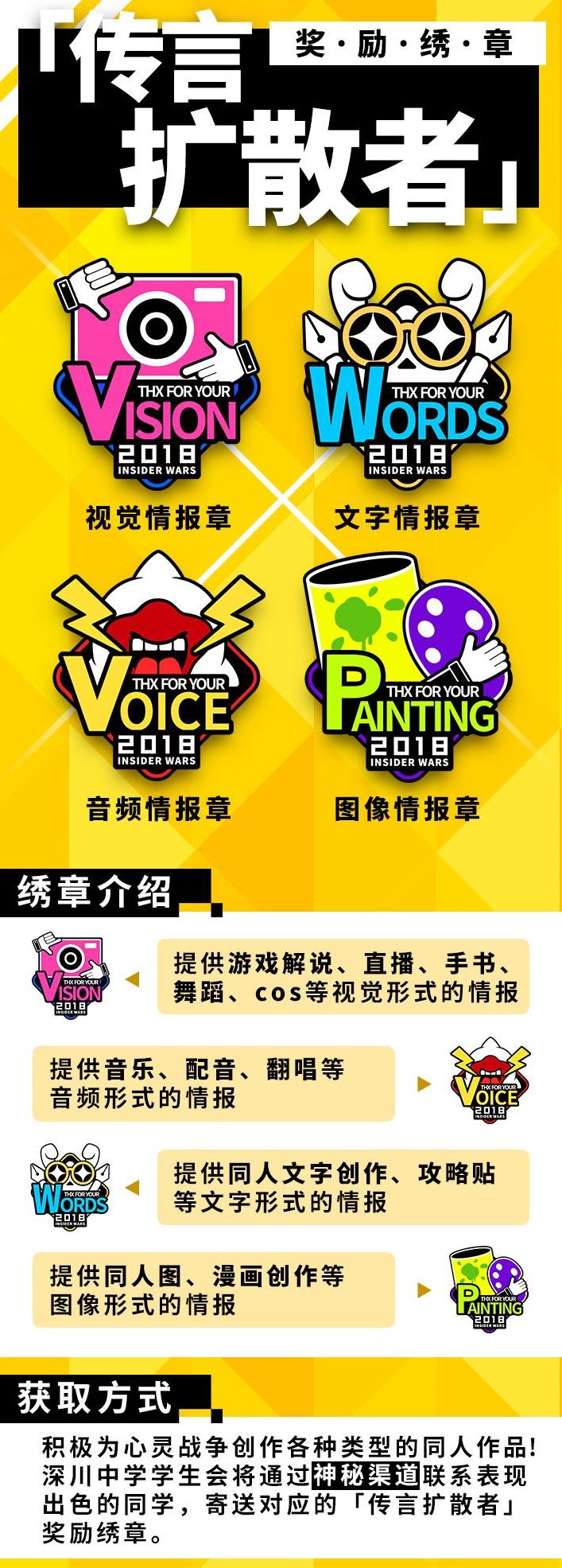 非常感谢大家一直以来对心灵战争的支持与热爱。四款『传言扩散者』奖励绣章长期为大家准备着!只要创作的心战同人作品包含心意,就有机会获得! 四款绣章情报如下: 同学们可以将作品(或作品链接)发布至本帖,也可以在新浪微博发布后艾特官博@心灵战争InsideWars,总之尽可能让街拍君们注意到大家的佳作哦! 当然,街拍君们也会暗中在各大社区追寻同学们的好作品,握紧相机! *盗用、剽窃他人创作的作品、过度