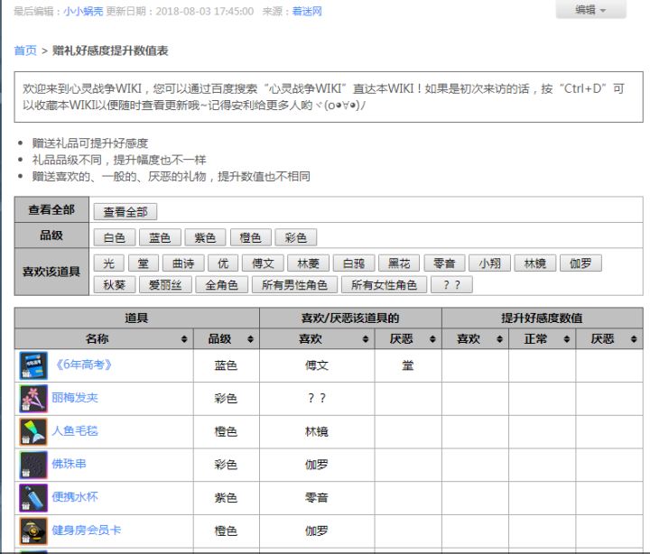 【心灵战争WIKI制作组】赠礼好感度提升数值表上线