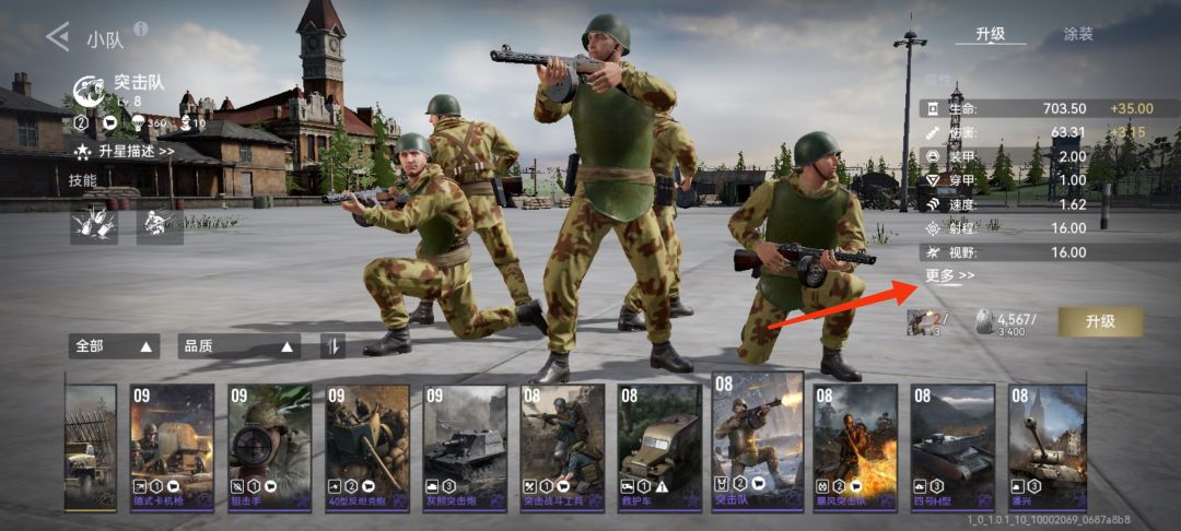 1.机械化步兵:一阶段步战大哥大,单挑几乎无敌(稍微能碰的有:德蓝卡掷弹兵升机枪、德紫卡掷弹兵、美喷火工兵、苏炸药包工兵等在有绿盾这些地理优势时可以打残,碎甲状态近距离几乎可以秒掉这些兵种)。常用来占点反步兵绕后打架设单位和反一阶装甲车(如德211)。 (1)常用思路:1v1和2v2很多会带211或者其他小车压制机枪兵,匹配到对方带车的,机械化占点最好靠近机枪点位,可以逼退或者炸掉,逼退升2出坦克