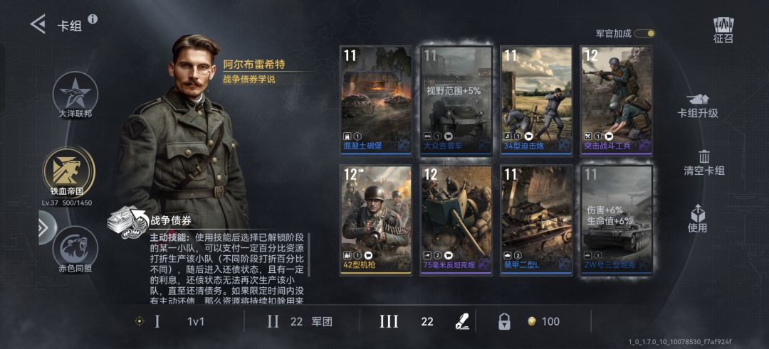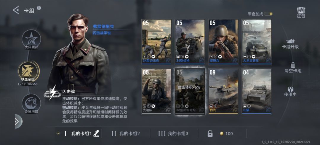 前面说了美国的上分思路,今天说说德国的。个人感觉德国卡组是所有卡组里面最能变通的,这里直接上我的思路阵容,不抢B玩法。 1.将领带闪电战(带近卫火炮压不住人没啥用,压住了又没必要,而且死贵;燃烧弹基本逼退架设单位,还不一定能赶回军营一次40弹药;闪电战可提速,配合载具打1v1效果更好一点) 2.一阶段:白工(紫工)-筒子兵(可反载具反碉堡反步兵核心★)-碉堡-金机枪(蓝机枪)-迫击炮(带金机枪得情