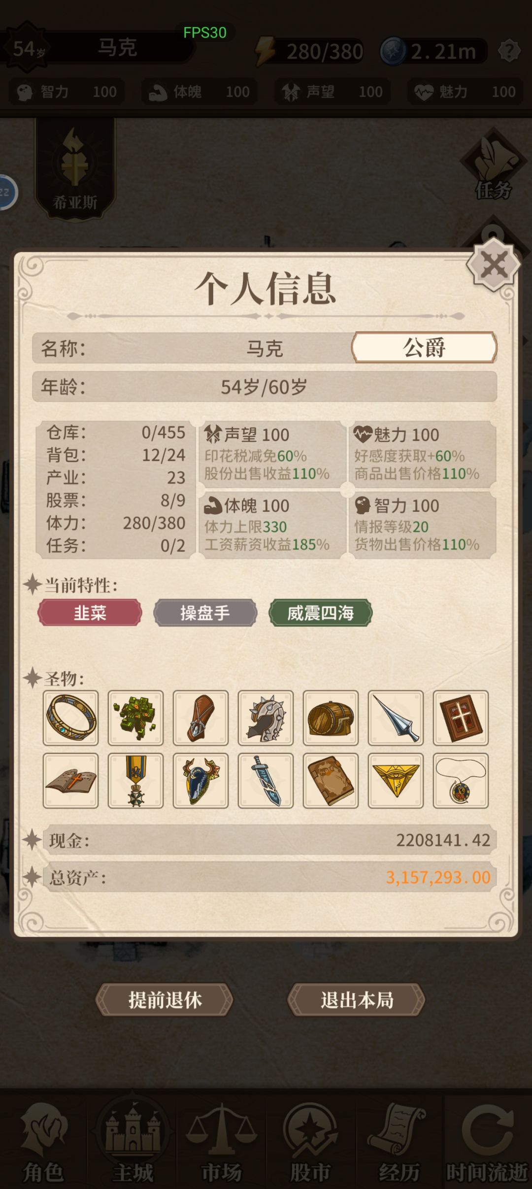 游戏制作还是很优秀的,画风很和谐,机制很丰富,故事情节应该主要是和人物有关(就我只玩过的这个结局来看是不错的) 游戏前期过渡比较公式,主升体力,打工赚钱(记得注意还债时间[表情_捂脸哭])凑10k钱出来(大概2-3k左右可以在自己的城里囤积居奇等回合差赚钱) 中期应该算是游戏最有趣的时候了,主要任务是到处跑商(本人初游玩许多机制其实接触不深,只拉了符合我xp的两个人物的好感所以没有解锁股票,所以不