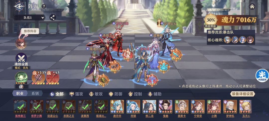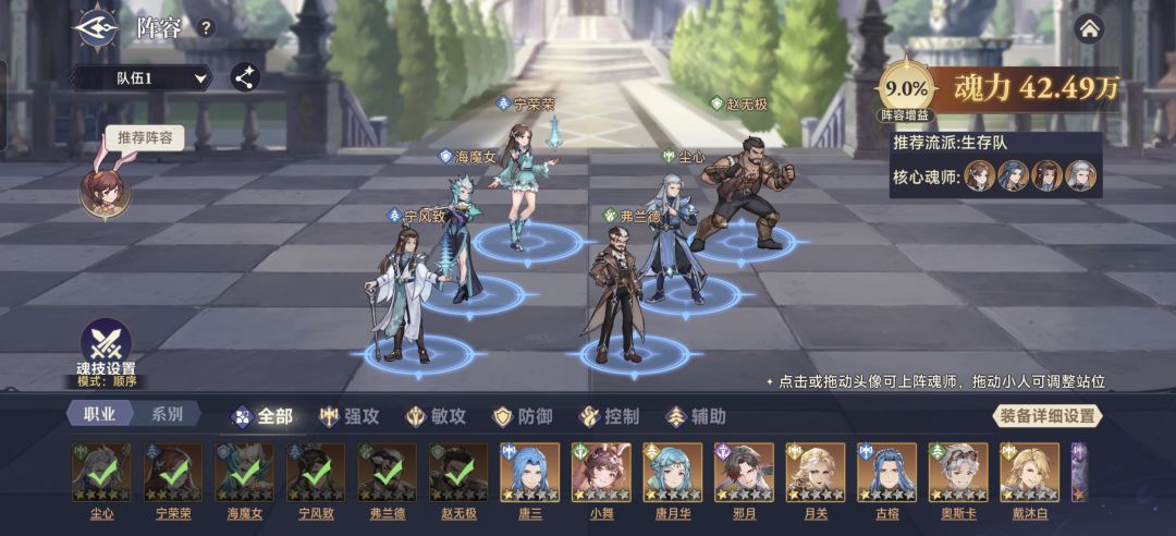尘心队伍打PVE除了推图其他确实不行,尤其是巨兽伤害巨低和斗罗之路卡单体。 但这个队伍属于中后期发力的PVP阵容,红五有追击之后,杀一个人基本上就结束了,辅助很关键,特别关键,双宁红1和鬼魅红1是阵容发力的开始,宁荣荣专武3星加暴击率,一般在五回合六回合直接秒完了,就剩一个练度最高的在场上和你打。 这个队伍建议全队带加生命上限的,资源主要给尘心,其次就是宁荣荣,两人专武优先三星。 生存队要靠叠血量
