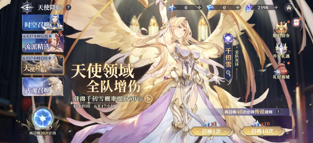 ※首先强调一下: 时空系千仞雪拥有被动光环,可以增加全队攻防血10%,并且可以叠加15%伤害提升和伤害减免(3星就能解锁)即便抽一个拿来替换阵容末位辅助,已经非常实用。 各氪度氪金建议: 1.纯白嫖 活动开启后,【礼包商城】中魂晶购买30抽+【天使商店】兑换5抽一定要拿下,这样加上【限时战令】,一期活动稳定嫖个42抽; 主线剧情【天使的抉择】还直接送一个千仞雪,稍微欧点,活动至少白嫖2星; 另外主