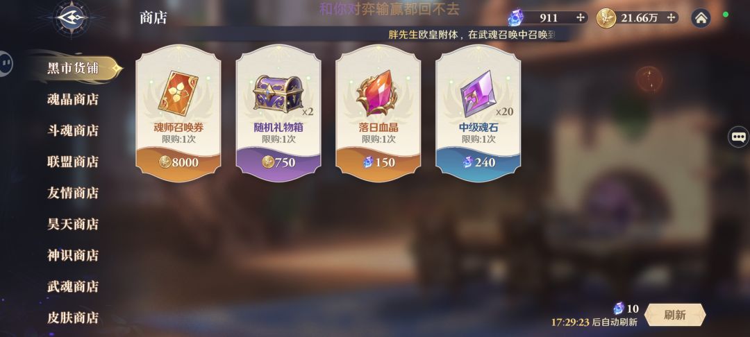 这次测试也快结束了,说一下商店兑换推荐(公测可能还有修改) 黑市 金币能买的的就买,目前来说金币是不缺的 注:每天一次免费自刷新,每周任务需要10次自刷 魂晶商店 每周的20武魂召唤道具买完(这东西获取渠道是真的少) 斗魂商店 普通:每日体力 召唤卷 高级:优先武魂召唤 联盟商店 每日体力 召唤卷 封号魂晶 注:武魂水晶解锁了之后必换完 友情商店 每周的4张召唤卷 友谊之证 后面的昊天商店看自己