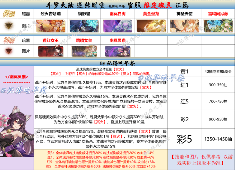 年底比较忙一点 早上才问到新魂灵没看到太多机制就只看到 【冥火】不知道是不是哪里解得有问题技能仅供兄弟们参考 具体以游戏实际上线版本为准升星太贵了 神话的魂灵要1300多抽才能拉满资源不够的兄弟们可以屯着等更高品质的魂灵或者等大佬抽完实测看下【冥火】的伤害怎么样【图片和技能仅供参考 仅供学习 仅猜测 以实际上线版本为准】觉醒之路 强强对决的玩法怎么几个月了还不返场这个玩法也没有