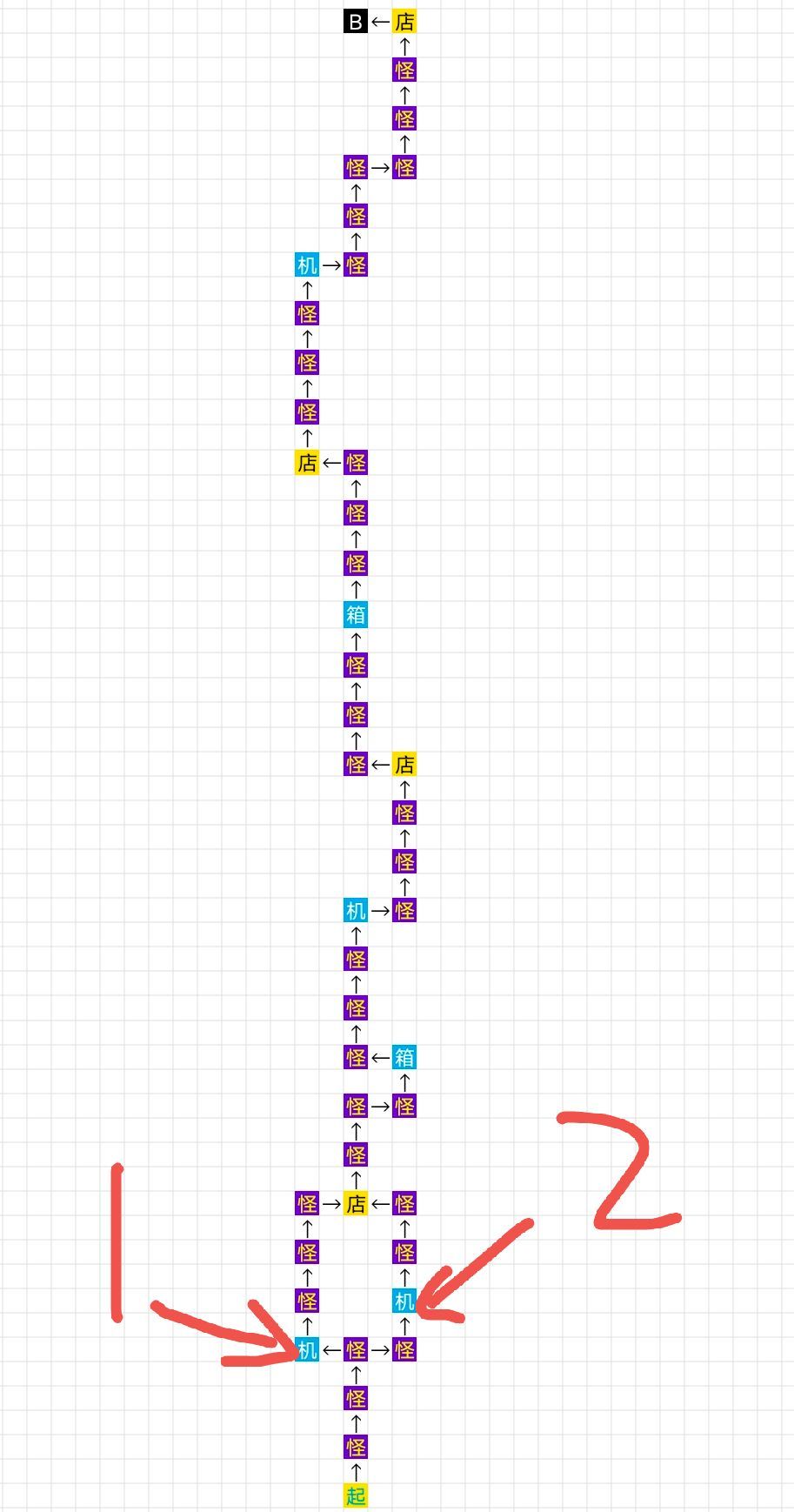 这条路线是为了给仙灵词条很好但是没装备或者没对应大道的仙灵准备的 因为等于有四个机缘 三个店 首先我们往上走左边1号机缘 这个机缘是可以直接看见是什么类的 如果是灵石矿类的 我们就走右边2号机缘 如果是仙池那种可以拿装备的 就是直接走左边 后面就是只有一条路线跟着图片走就行