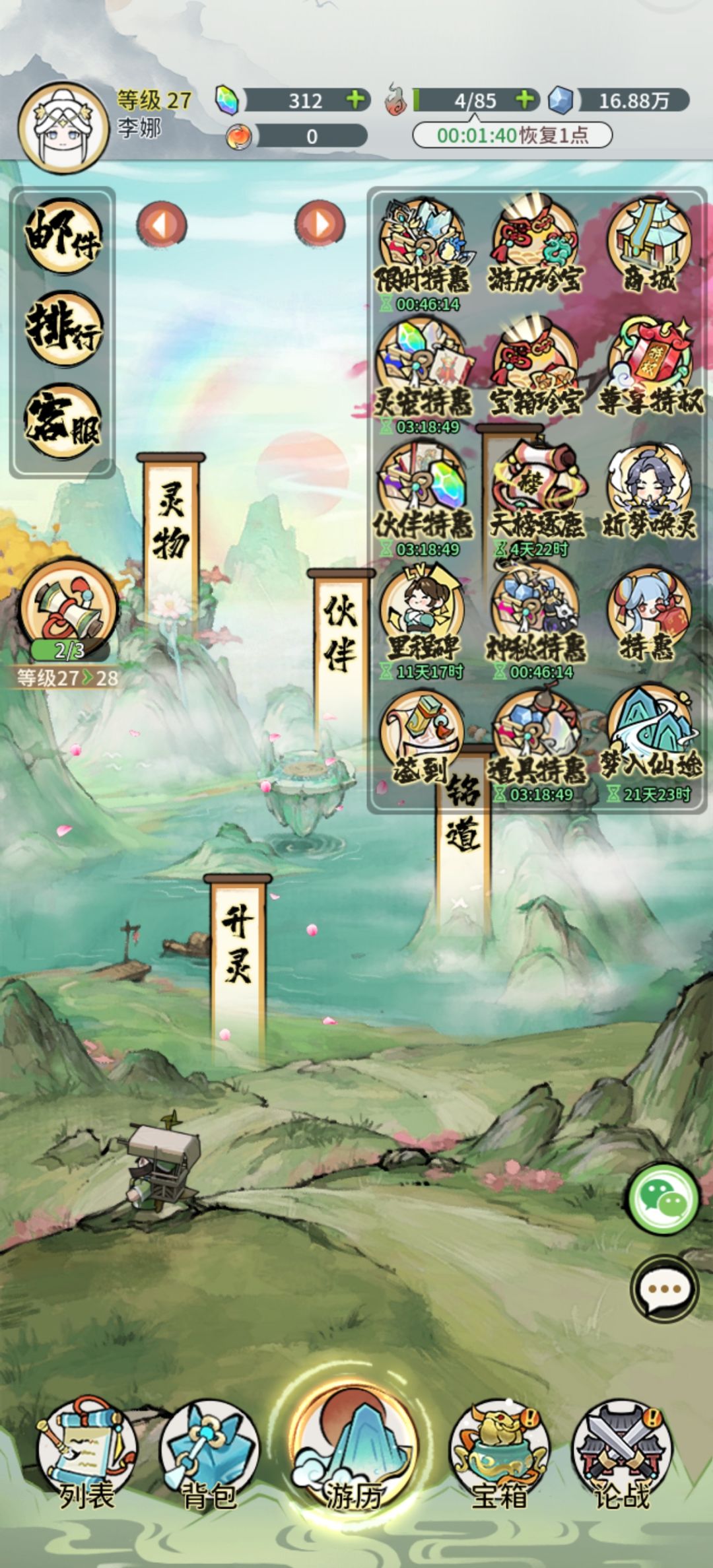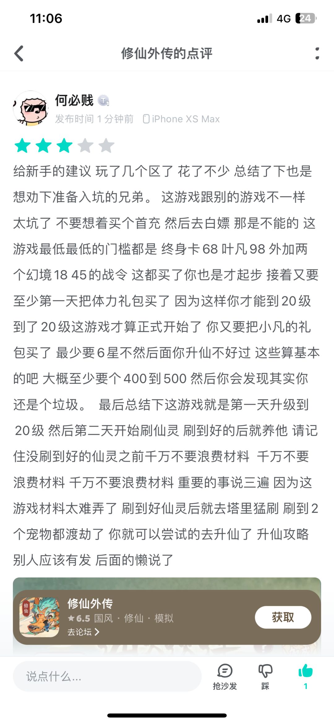 没玩多久但是也是100级单体200亿战力的老东西了。 对于该游戏 人物画风还是可以的 希望往后可以把伙伴的立绘也画出来 光6个仙友有立绘是真的少啊,不够看。 然后就是游戏体验 如果想玩,个人建议是需要氪一个68的 这是基础游戏大部分奖励需要看广告 这边建议出一点日常活动,给一些灵气,仙晶和箱子。 0氪玩起来也舒服一点 游戏的主要玩法是搞仙友和伙伴,然后带着伙伴和仙友历练,刷胚子然后渡劫升仙。 之后
