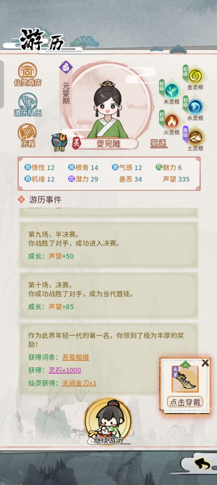 一开始只是像往常一样机械化的点着,然后火子哥问我自己是不是有病,我说你没病,火子哥给了我一把渡劫期的宝剑,我当时就害怕极了,哈哈哈哈!说实话玩这游戏2天,第一次见到渡劫期的法宝,拿到手接下来一部分事件就简单了,但是没爽多久,就发现还是过不了炼虚期的事件,啧ps:希望这游戏继续加油吧,希望更新词条可以多一些,建议参考一下另一款文字游戏《修仙模拟器》和《异世界转生模拟器》,前者音乐,后者在事件的精
