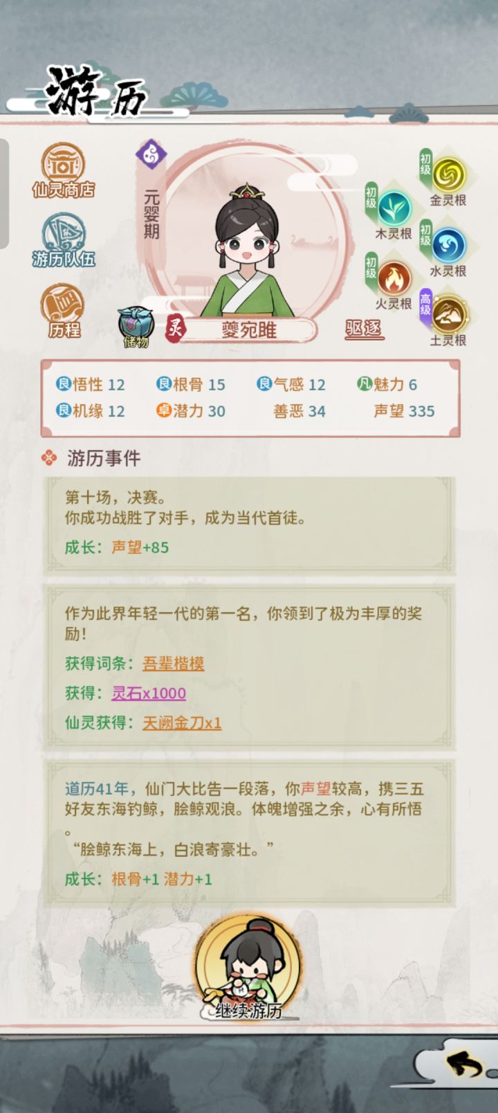 #新手攻略 萌新入坑重点汇总1.潜力决定可以游历的时间和仙灵的境界,每个境界都有一个潜力临界值,当突破时仙灵潜力大于临界值时可以多次突破且一次比一次成功率高,但只有第一次突破就成功有加额外属性,反之则只加相对于第一次突破就成功加的一半声望,所以当突破成功率没有100%时最好用渡劫丹2.仙晶最好是全部用来抽人物,每抽一次加一点积分,满100点可自选红色伙伴,优先选择叶凡3.商城广告必看,除了