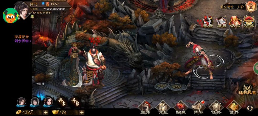 始皇秘境人魂(输出建议带一个崩碎,崩碎无法叠加没必要2个,还需要带一个闪避,否则有些战斗会被波及死亡) 第一个BOSS:内功免疫,打法简单,苏+外功角色,输出不足的情况下,手操,不释放苏的奥义即可。 第二个BOSS:外功免疫,同样简单,寓言核心的内功阵容,如输出不足,建议主角切内功,可自动。 第三个BOSS:BOSS速度23000,输出足够的情况寓言核心的常规阵容即可,不需要打断,复活一次后可强行