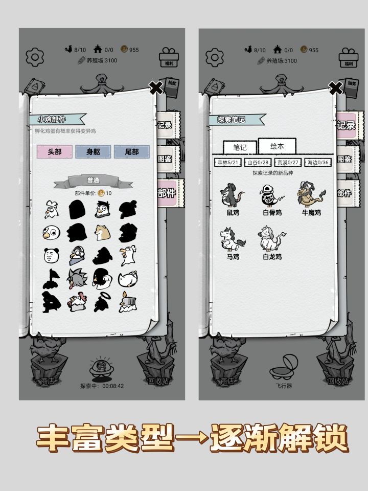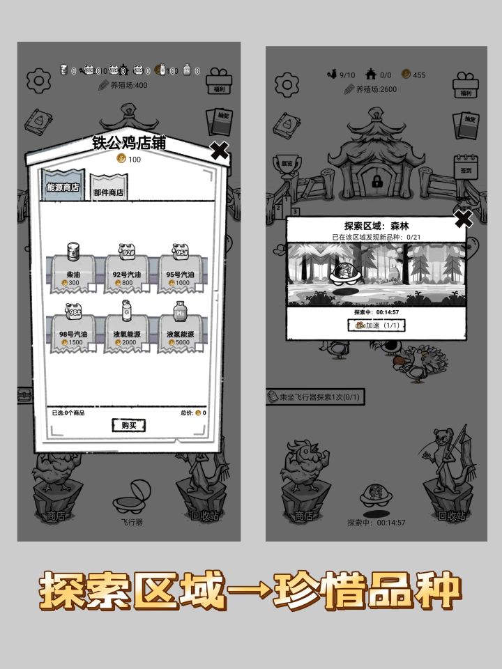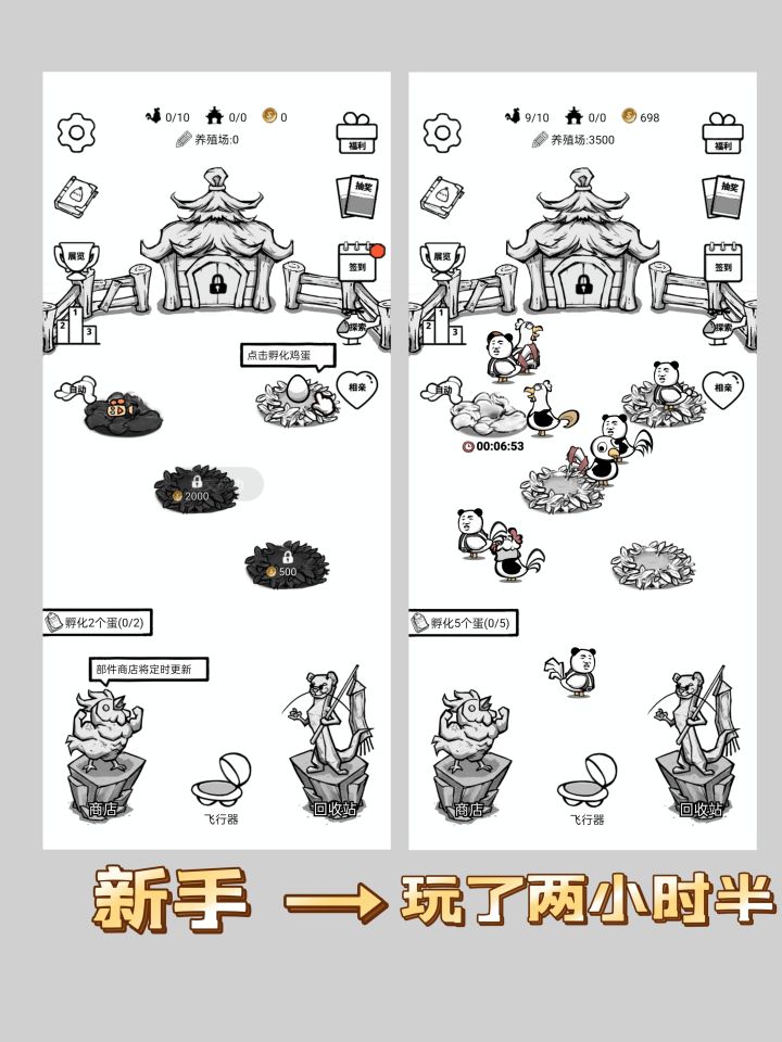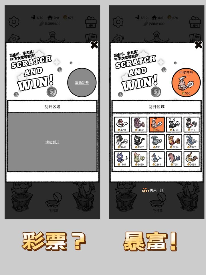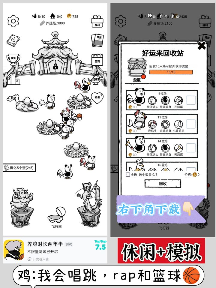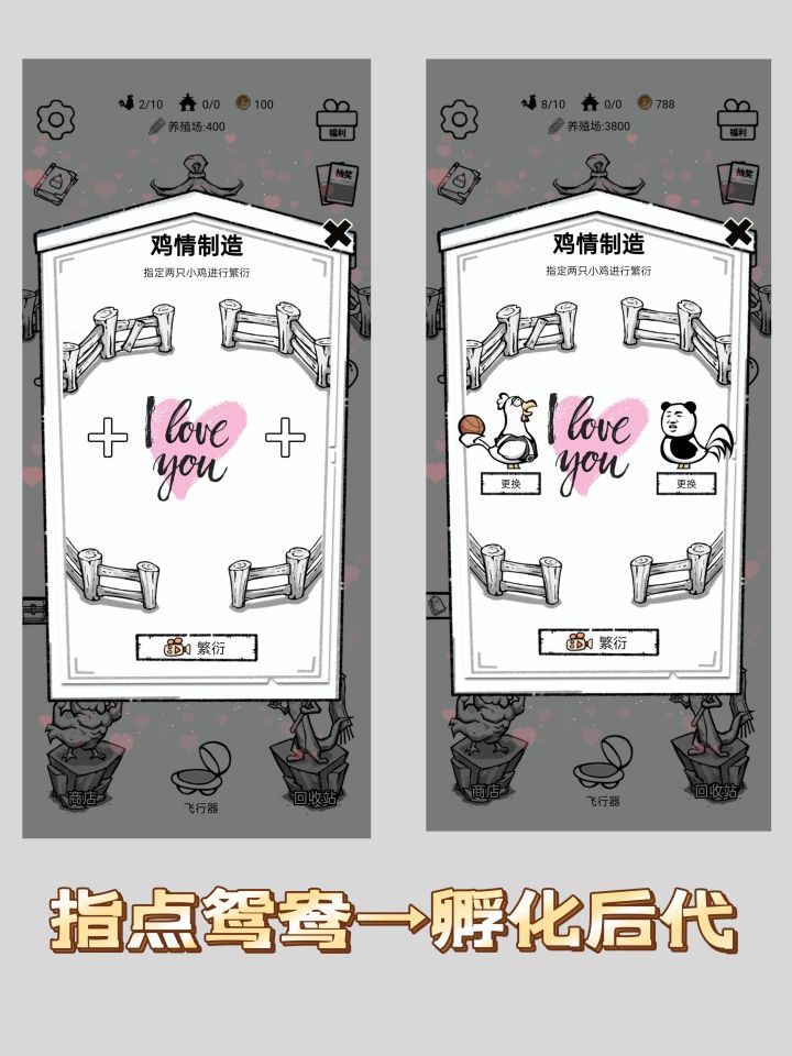 ✨一款玩法简单,画风有趣,融梗恰当的小游戏✨蛋🥚→鸡🐔 🐔有3个部位 头 身子 尾→ 遗传/概率变异 开小飞船探索区域→解锁更多🐔种 选择两只鸡相恋→什么赛博丘比特啊喂! ✨彩票功能免费🆓,一夜暴富💰不再是梦! ✨喜欢休闲游戏的可以体验试试看!#游戏种草计划#游戏安利#单机游戏#吃瓜爆料