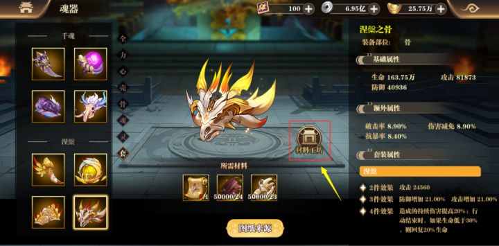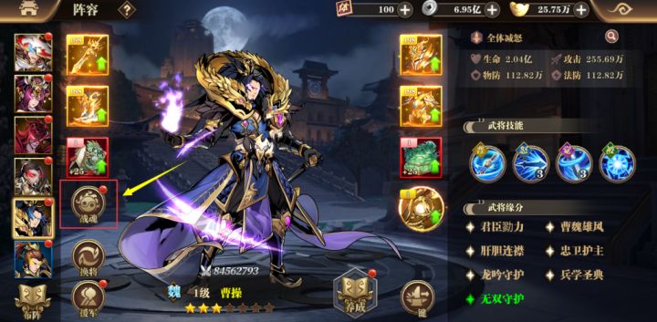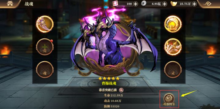 武将战魂系统 金色武将升到3星后,可以开启战魂系统。通过消耗武将觉醒石对战魂进行升星,战魂达到5星后,武将战魂完全激活并出现在武将的身后。武将原有的怒气技升级为更加强力的觉醒怒气技,并且新增一个觉醒被动技能。战魂觉醒前 战魂觉醒后 武将战魂觉醒后,可额外佩戴6件魂器,集齐一定的数量的同类型魂器可激活套装效果,获得大量的属性加成和战斗被动技能。在魂器图鉴系统中可以浏览所有魂器需要的制造