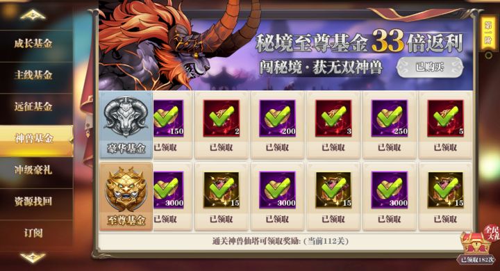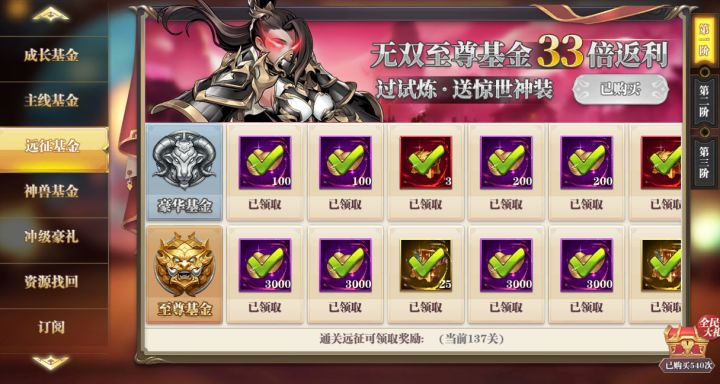 游戏内共有四款基金,分别为成长基金,主线基金,远征基金,神兽基金。成长基金共有两阶,完成一阶后开启二阶,基金奖励与主角等级相关,奖励为元宝。主线基金共有四阶,完成一阶后开启二阶,基金奖励与主线关卡相关,奖励为元宝,高级召唤令,金将碎片。远征基金共有三阶,完成一阶后开启二阶,奖励与远征的通关数相关,奖励为元宝,红色装备碎片和金色装备碎片。神兽基金仅有一阶,奖励与神兽仙塔层数相关,奖励为元宝,
