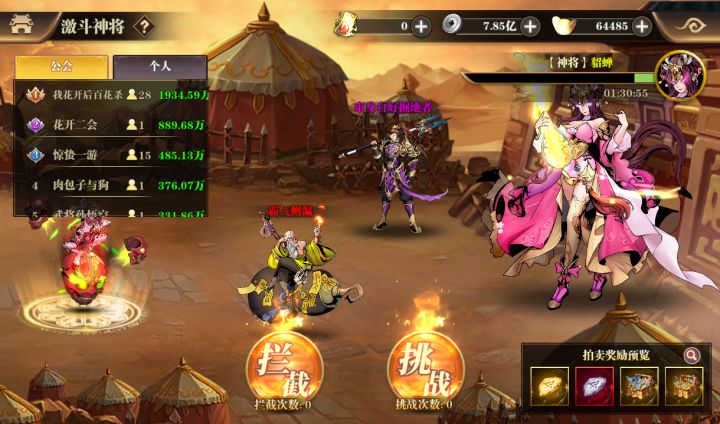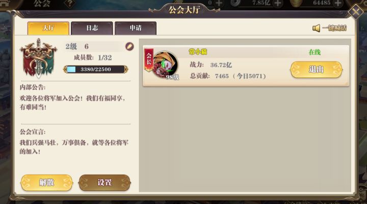 公会是每款游戏必不可少的部分,下面为大家简介一下。玩家到达一定等级,可选择加入公会或自己创建公会,创建公会需要2000元宝。公会初始可容纳30名成员,公会等级每提升1级,成员数+2。公会大厅:大厅界面可修改公会名称,设置加入门槛(等级以及是否需要审核)。可查看公会日志。同意或拒绝他人的入会申请。激斗神将:开启时间:每日00:00~14:00可进行激斗神将.每次首领开启玩家拥有3次挑战机会和