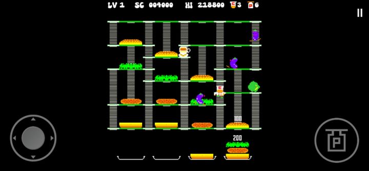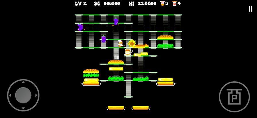 这个游戏的目标是控制厨师来制作汉堡,同时避开敌人:茄子、番茄和酪梨。你可以选择使用四个方向的虚拟操纵杆或虚拟十字键来控制厨师。