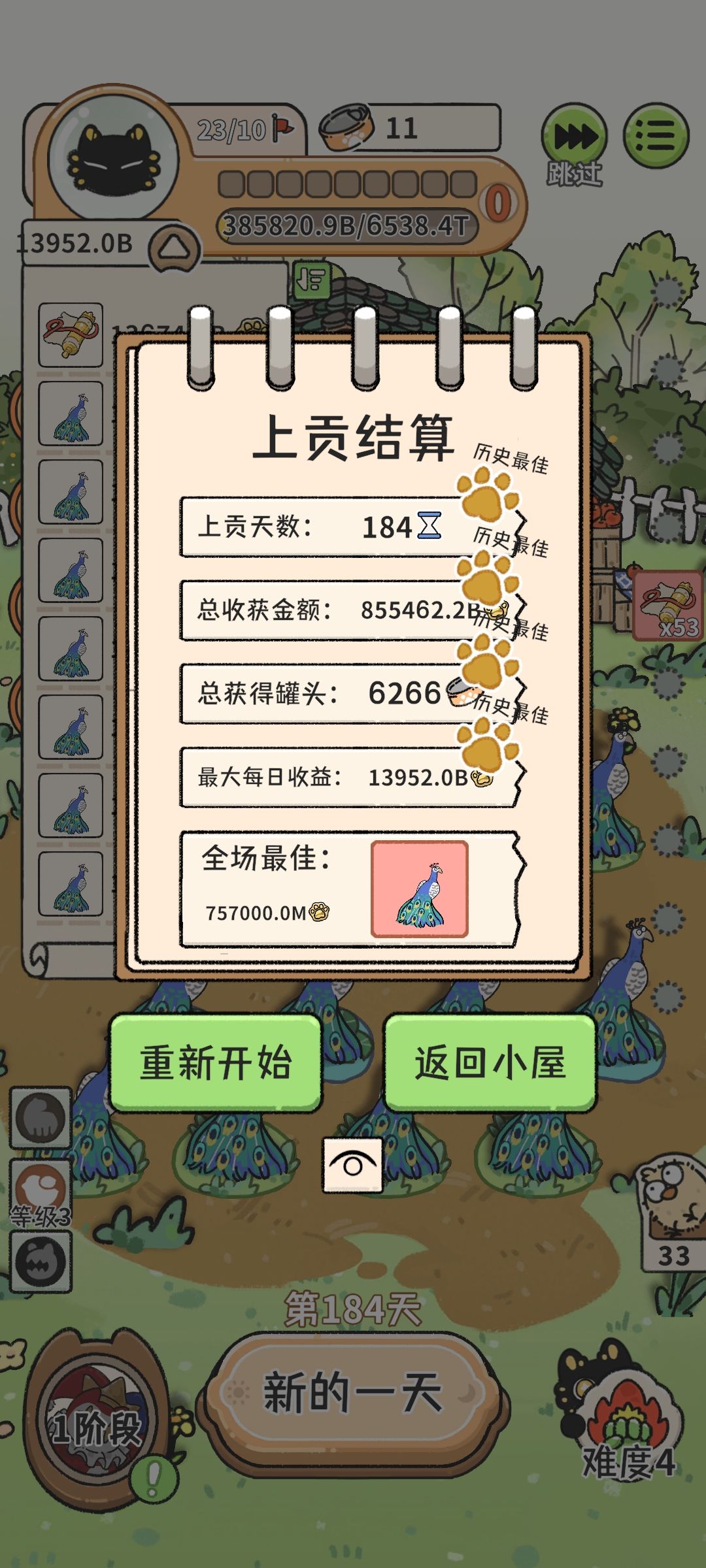 只说最优解 角色选小丑,开局野猪家畜流最多可以到第五回合,期间找到/变到老虎全喂给老虎。然后老虎转成孔雀(期间除了一些关键道具罐头都留着吃利息)。下个商店鸟类拉满,鸟巢看到就点。场上有差不多7-8个鸟巢够了。 接下来找四不像,用罐头控制孔雀数量,淘汰低产费的孔雀,这一步能轻松到99000。(日均轻松过万) 再接下来找恐鸟,把所有的孔雀喂给特定的一只,然后重复孔雀的过程。 道具后期选择生蛋几率的,移