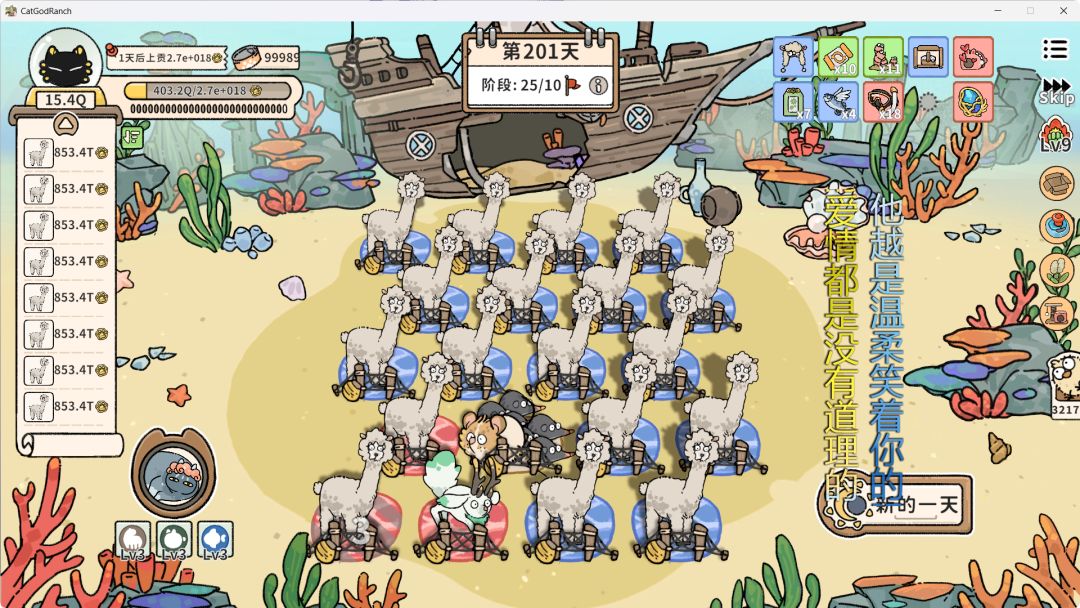 这个打法操作很简单,不过上限就卡在201天。25阶段需求已经不在一个数量级了。 方法是先养一只杰瑞,刷出来爱的小屋就可以开始下崽了。四不像配一只杰瑞。其他都慢慢换羊驼。我刷的是繁殖goujing,花枝鼠或兔兔也都可以用来繁殖,只有细微操作需要调整。 尝试了大白鲨,美人鱼,海豚,洞穴挤goujing发现都不如羊驼倍率。