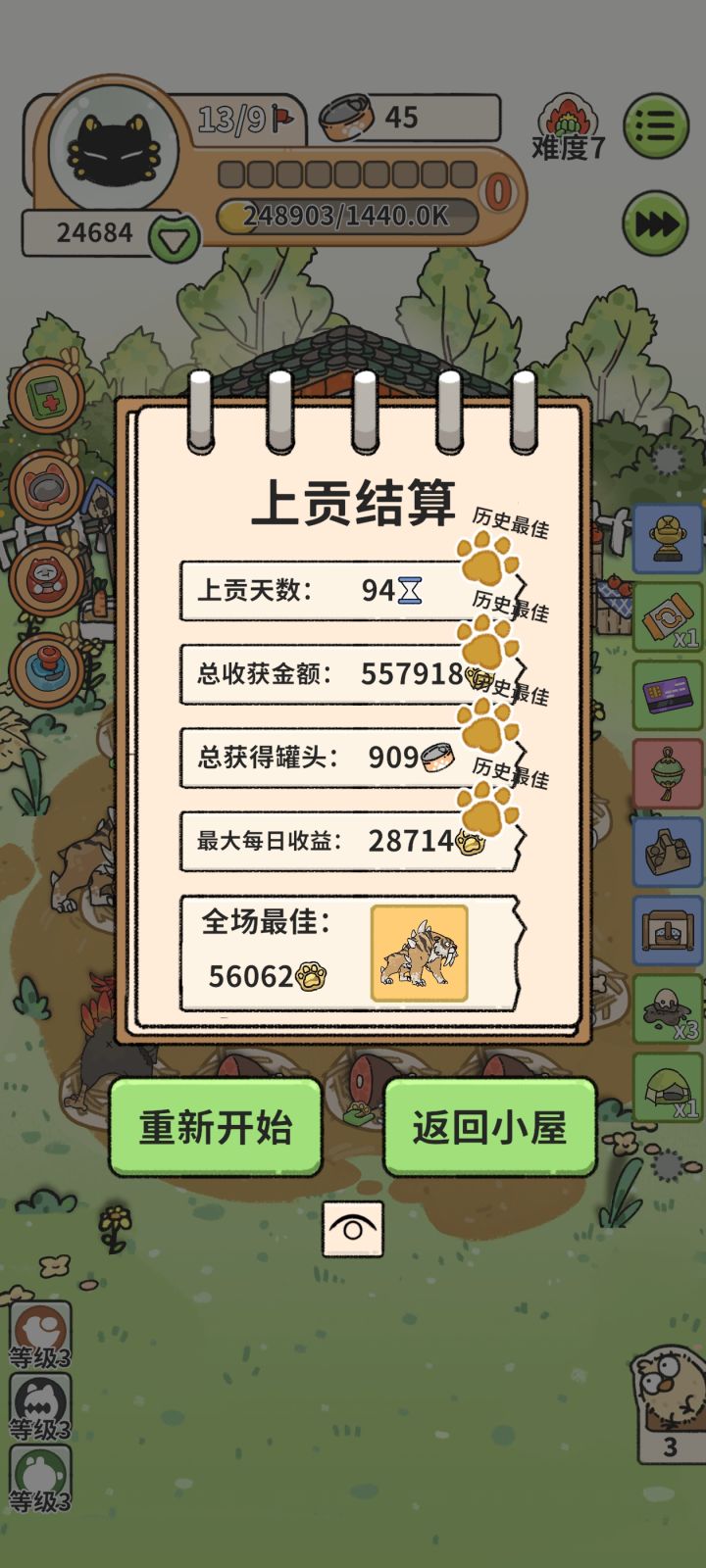 先上图,点到不想点了,罐头算是10万溢出的,pc端同样阵容拿过1100+天还没到达极限#开局玩具>必选:逗猫棒+纸箱子(拿化石扫描仪<获得化石数量x2>+垂耳兔)次选:伊丽莎白圈,电动摇杆(我超级喜欢配合这两个)角色:大骰(5阶段转克鲁克山)局面:必须要场上有迅猛龙(可以的话用大骰技能给它刷一下获得化石数量)#初期场上迅猛龙<3只时优先选择迅猛龙,>3时选择小盗龙,当场上小盗龙持有