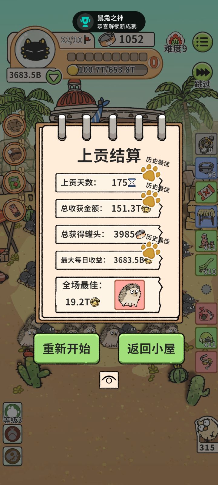 玩了两个星期,全成就了。简单分享一下高分攻略。字数有点多,就分两篇来写了。--------------------------------------------- 第一个是 爱的小屋+鼩鼱 无限繁殖流。玩具选 纸箱子, 木鱼 和 激光笔,猫神选 吉格斯,种族选 鼠兔家族。开局动物选鼹鼠,道具选 密集恐惧治疗仪。然后动物只拿 鼩鼱,尽快升级 鼠兔家族的天赋,道具找 露营帐篷。其它看情况拿或